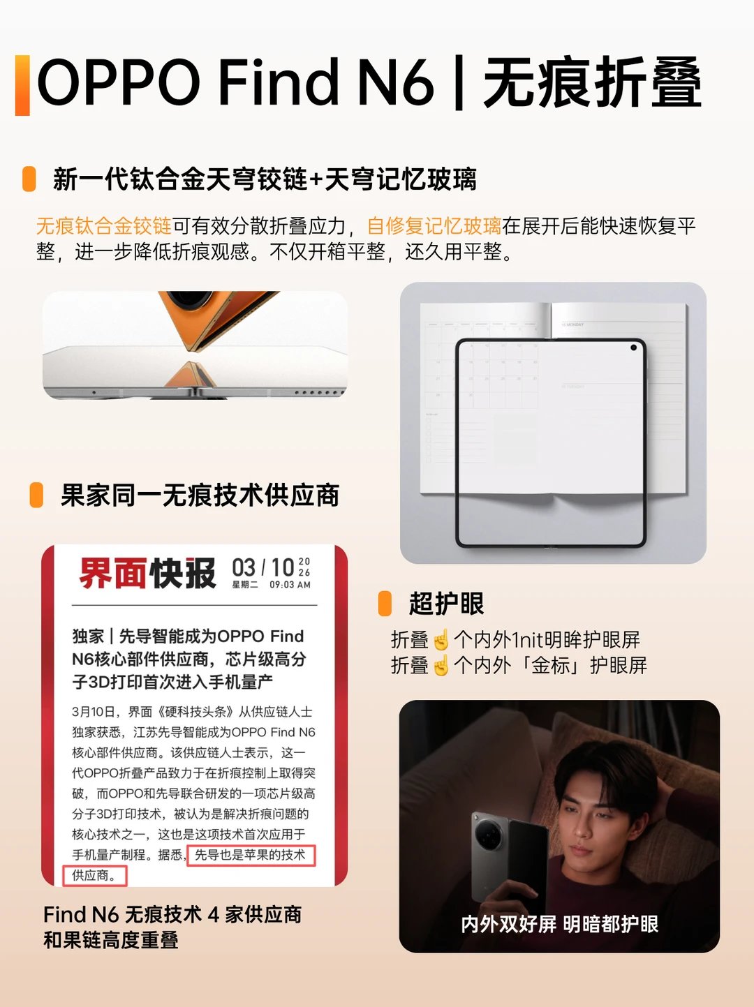 新一代钛合金天穹铰链和天穹记忆玻璃这两大黑科技的结合,屏幕摸着真的平整无痕!不仅开箱平整,久用也一样平整 。今天还曝光了Find N6无痕技术供应商也是果子的供应商,OPPO已稳步走在折叠屏手机前列。