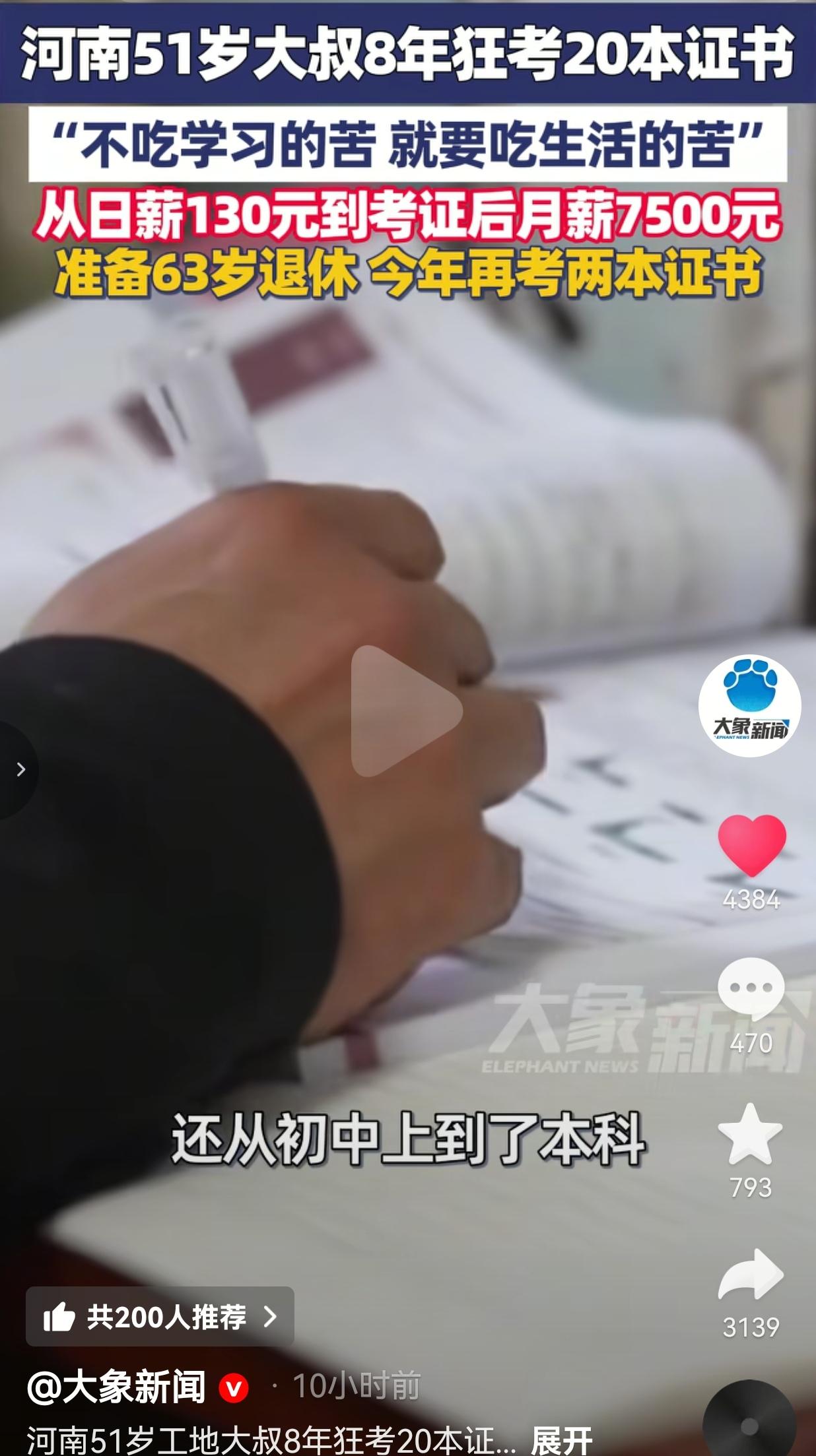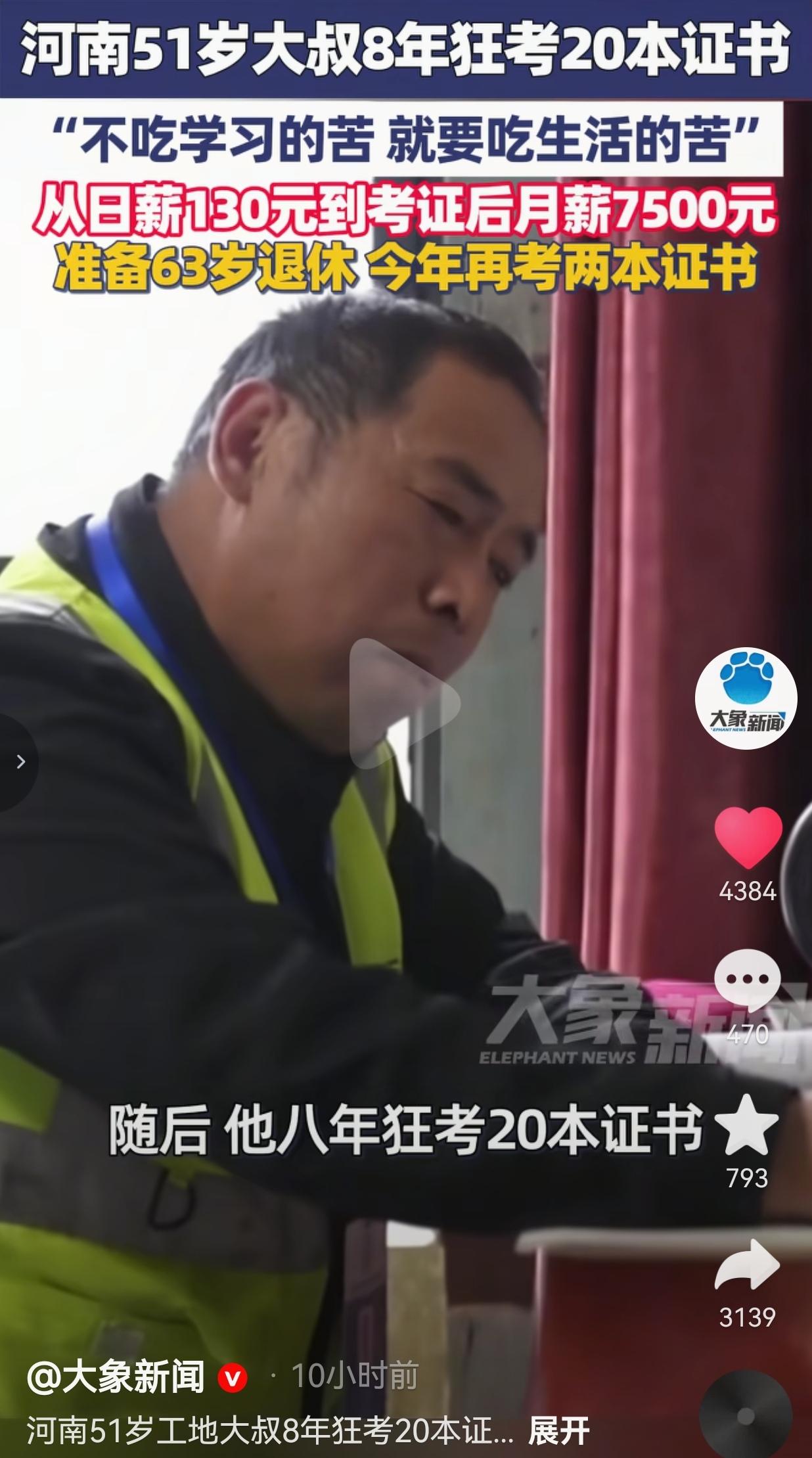 太厉害了!51岁工地大叔8年狂考20本证!从日薪130到月薪7500,狠狠打了“躺平党”的脸! 2017年,他揣着初中文凭,背井离乡去杭州工地当小工,每天搬砖扛水泥,日薪130块,包吃包住,累得腰都直不起来。 看着身边年轻力壮的小伙子,他心里明镜似的:再干几年,体力跟不上,连这130块都挣不到! “不吃学习的苦,就要吃生活的苦”,这句话成了他的口头禅。别人下班刷短视频、喝闷酒,他就窝在工棚里就着应急灯看书;别人周末睡懒觉,他坐最早的班车去上培训班。 从建筑电工证开始,他一本接一本往下啃,8年时间,硬生生考了20本证书,还把学历从初中提升到了本科! 现在的他,早已告别了尘土飞扬的工地,成了坐办公室的技术岗,月薪稳稳7500,包吃包住,再也不用靠卖力气换饭吃。今年51岁的他,还计划再考两本证,准备干到63岁再退休! 网友看到后评论说:“我45就觉得自己老了,天天混日子,看了大叔我脸都红了!明天就去报个班,不能再废下去了!” 也有的网友说:“那些天天喊“内卷”“躺平”的年轻人,看看人家!51岁都在拼命,你20多岁凭什么摆烂?” 还有的网友说:“太励志了!只要想改变,什么时候都不晚!我也要捡起我的专业书,为了孩子再拼一把!” 也有的网友说:“我懂这种苦!工地上的日子一眼望到头,大叔用行动告诉我们,知识真能改命!” 我看完这段新闻,鼻子直发酸,心里又燃得发烫! 最烦那些站着说话不腰疼的人,一看到别人努力就阴阳怪气:“都这岁数了还折腾啥?”“考那么多证有啥用?” 有用吗?太有用了! 这20本证,是他用无数个挑灯夜读的夜晚换来的,是他拒绝酒精和短视频的诱惑换来的,是他对“认命”两个字最响亮的反驳! 他不是在跟谁较劲,他是在跟自己的命运较劲!是在为自己的晚年挣一份体面! 别跟我说什么“年纪大了”“来不及了”,那都是你不想努力的借口! 51岁怎么了?8年怎么了?只要你还想喘口气,还想活得更有尊严,学习就永远不算晚! 那些在被窝里刷着短视频,一边焦虑一边刷的年轻人,看看这位大叔! 他用行动告诉你:真正的绝望,不是年纪大了,而是你连试一试的勇气都没有! 最后送所有人一句话:别在该吃苦的年纪选择安逸,更别在还能拼的年纪选择认命!你今天偷的懒,都会变成明天扇在你脸上的耳光! 对此,你怎么看?