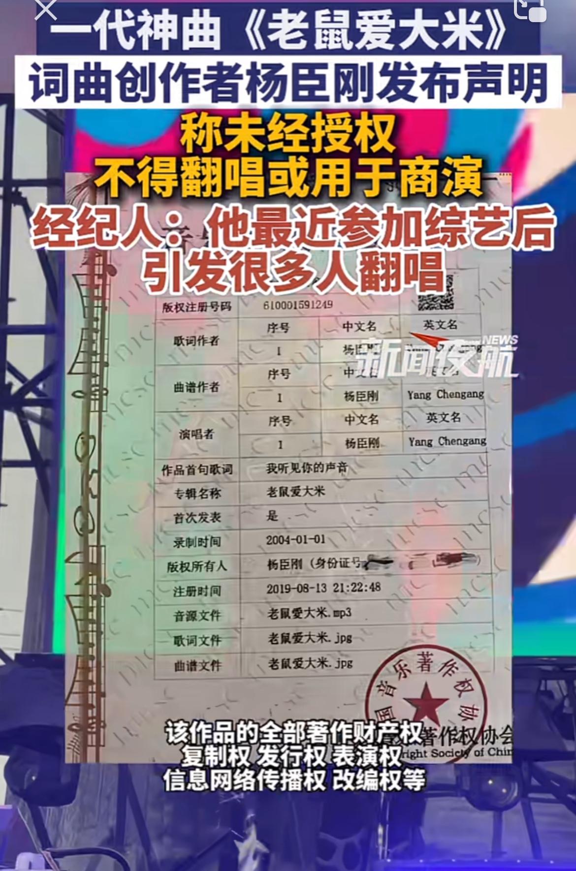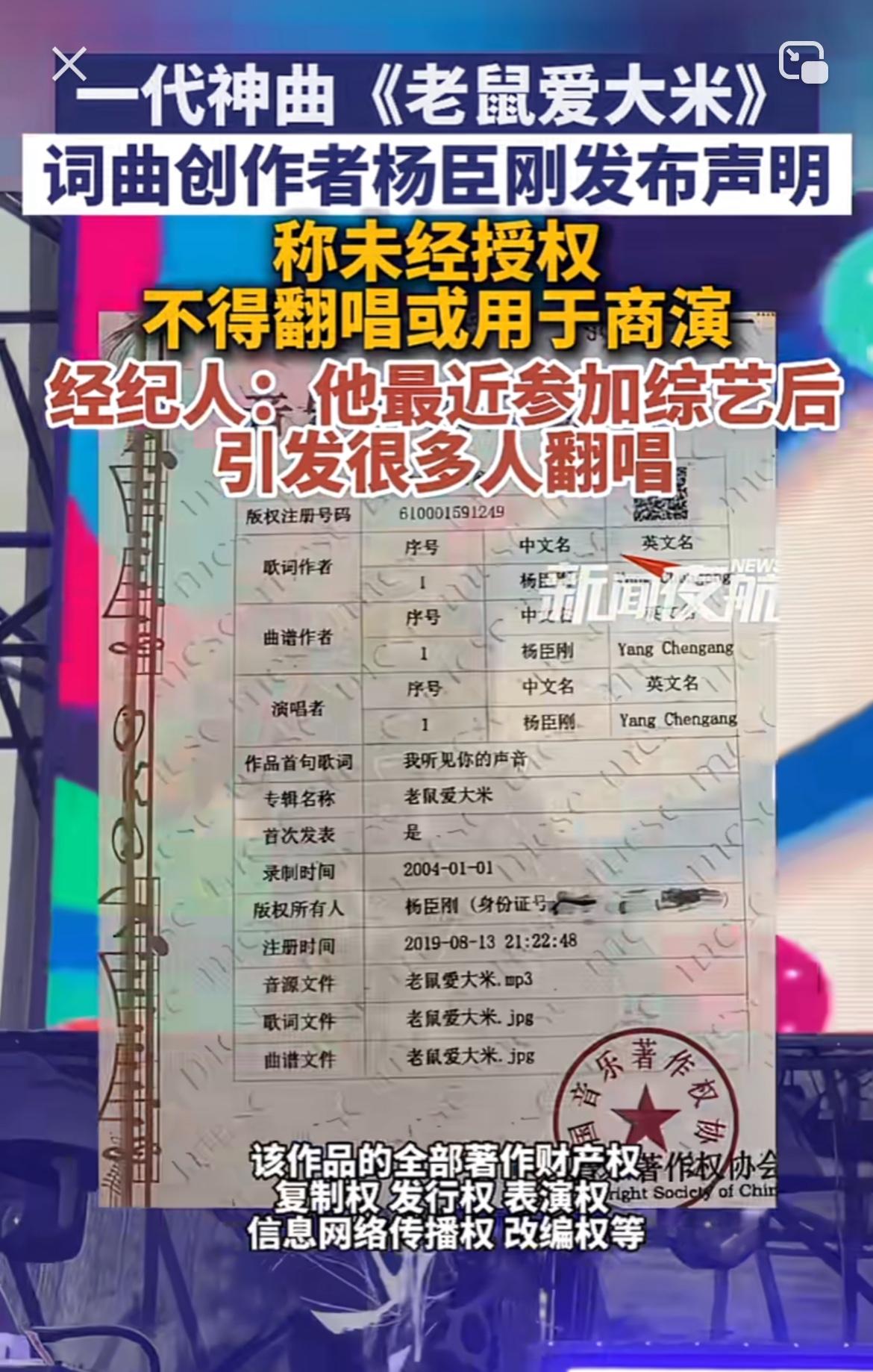 《老鼠爱大米》当年那可是火遍大江南北,谁嘴里不得哼上两句“我爱你,爱着你,就像老鼠爱大米”。现在词曲作者杨臣刚发声明,未经授权不得翻唱或用于商演,这也是维护自己合法权益嘛。 想当年这首歌红得离谱,大街小巷都在放,各种场合也都能听到翻唱。但很多翻唱可能都没经过授权,杨臣刚现在站出来发声,也给那些随意翻唱用于商演的人提了个醒。毕竟创作一首歌不容易,创作者有权保护自己的作品。以后大家再翻唱或者用这首歌商演可得注意了,别一不小心就侵权咯。
