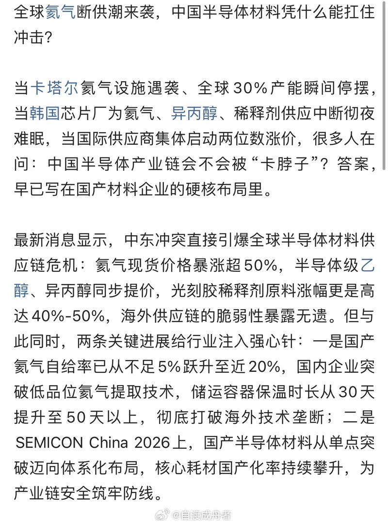全球氦气断供潮来袭时,中国半导体材料能扛住冲击,主要得益于国产技术突破、进口来源