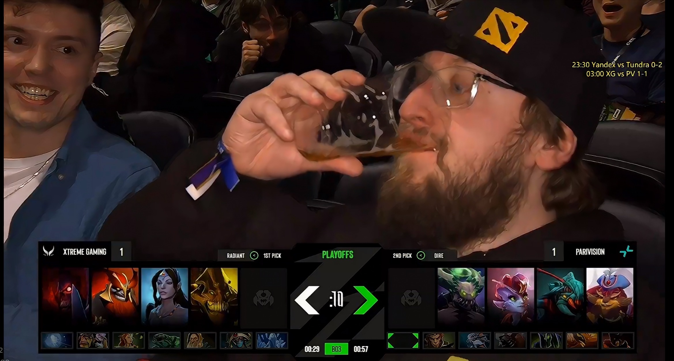 哈哈这现场人手一杯啤酒,摄像机照到哪那人就把一杯干了,然后全场欢呼!dota2