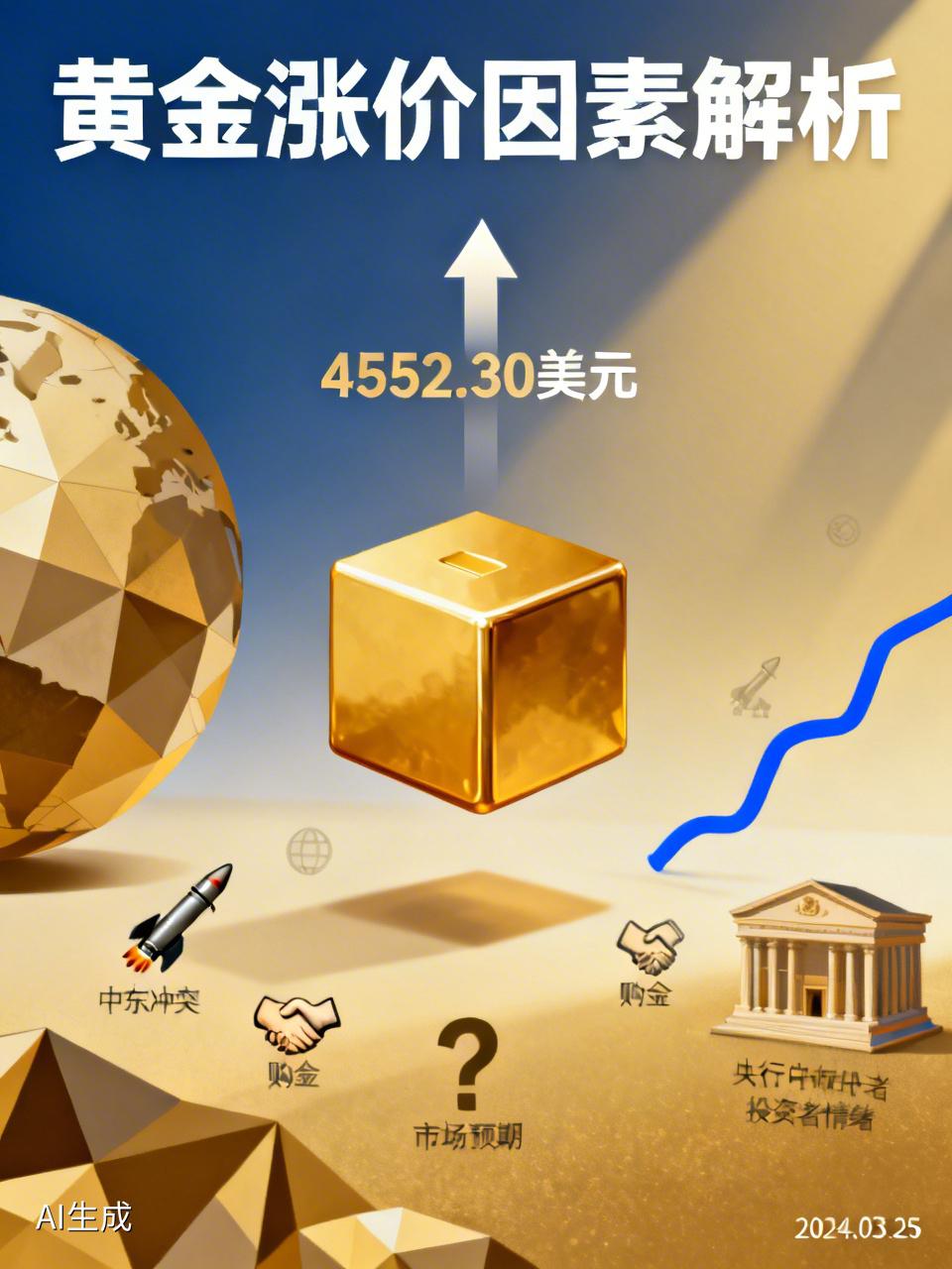 黄金涨价受多种因素影响。全球经济不稳定时,投资者把黄金当避险资产,需求增加推动价格上升。货币贬值或通胀压力大,大家也会买黄金保值。 地缘政治方面,像近期中东地缘冲突,伊朗拒绝美国停战方案,局势紧张,投资者为避险将资金转投黄金,拉高价格。25日纽约商品交易所4月交割的黄金期价收于每盎司4552.30美元,上涨3.41%。 此外,央行购买黄金增加储备,也会加大需求提升价格。投资者情绪和市场预期也有作用,若预期通胀上升或经济衰退,就会推动金价上扬。