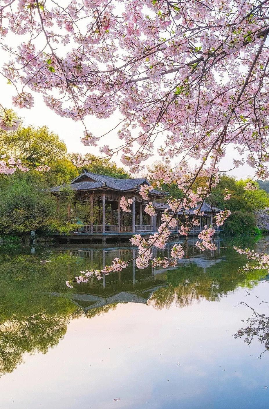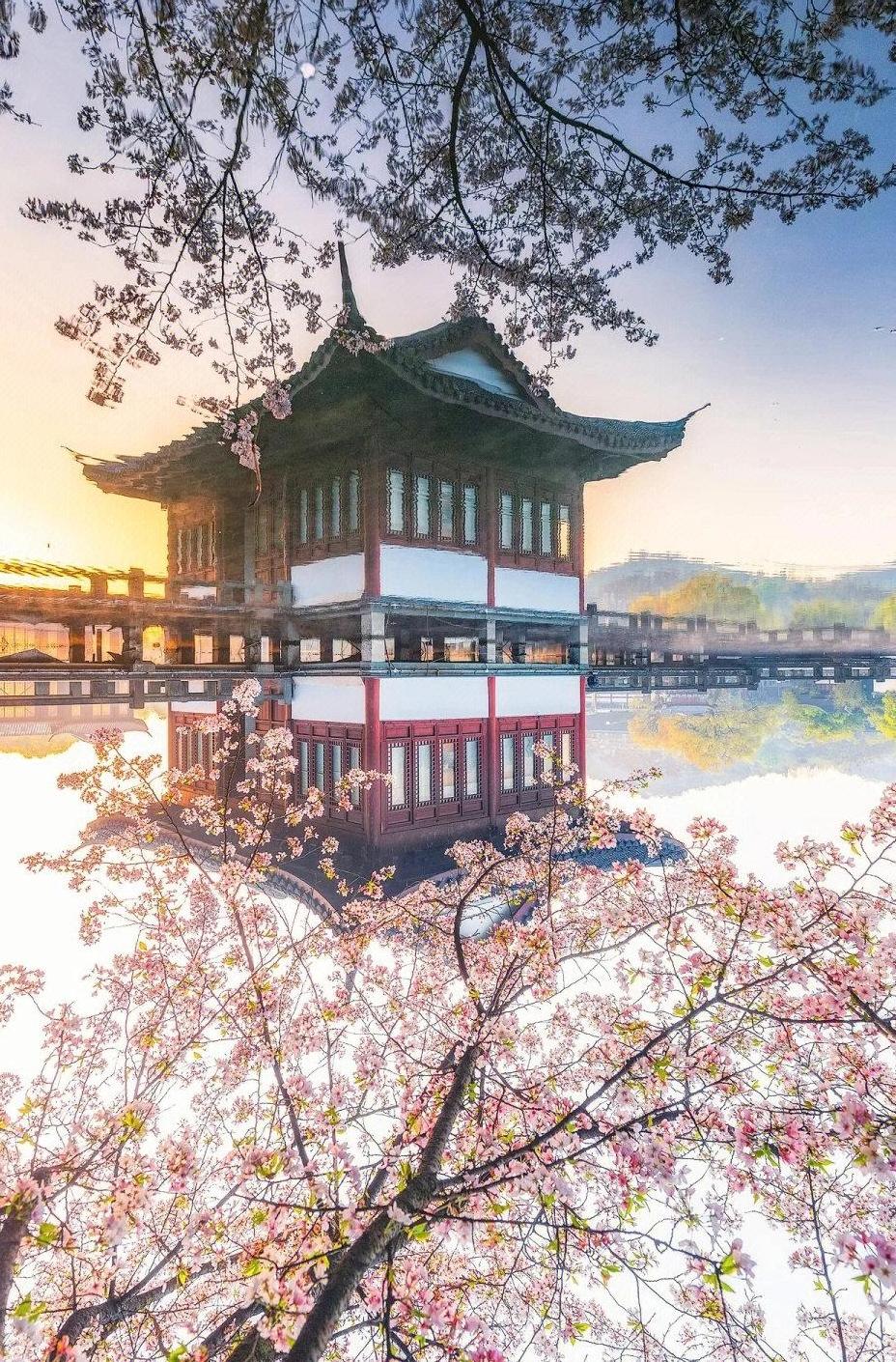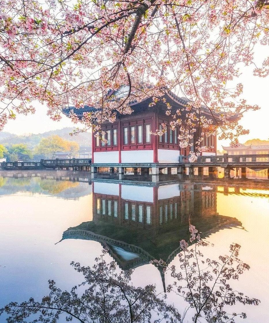 碧波荡漾映桃红, 春意盎然西湖边。 亭台楼阁倒影美, 如诗如画藏心间。 春日生活打卡季