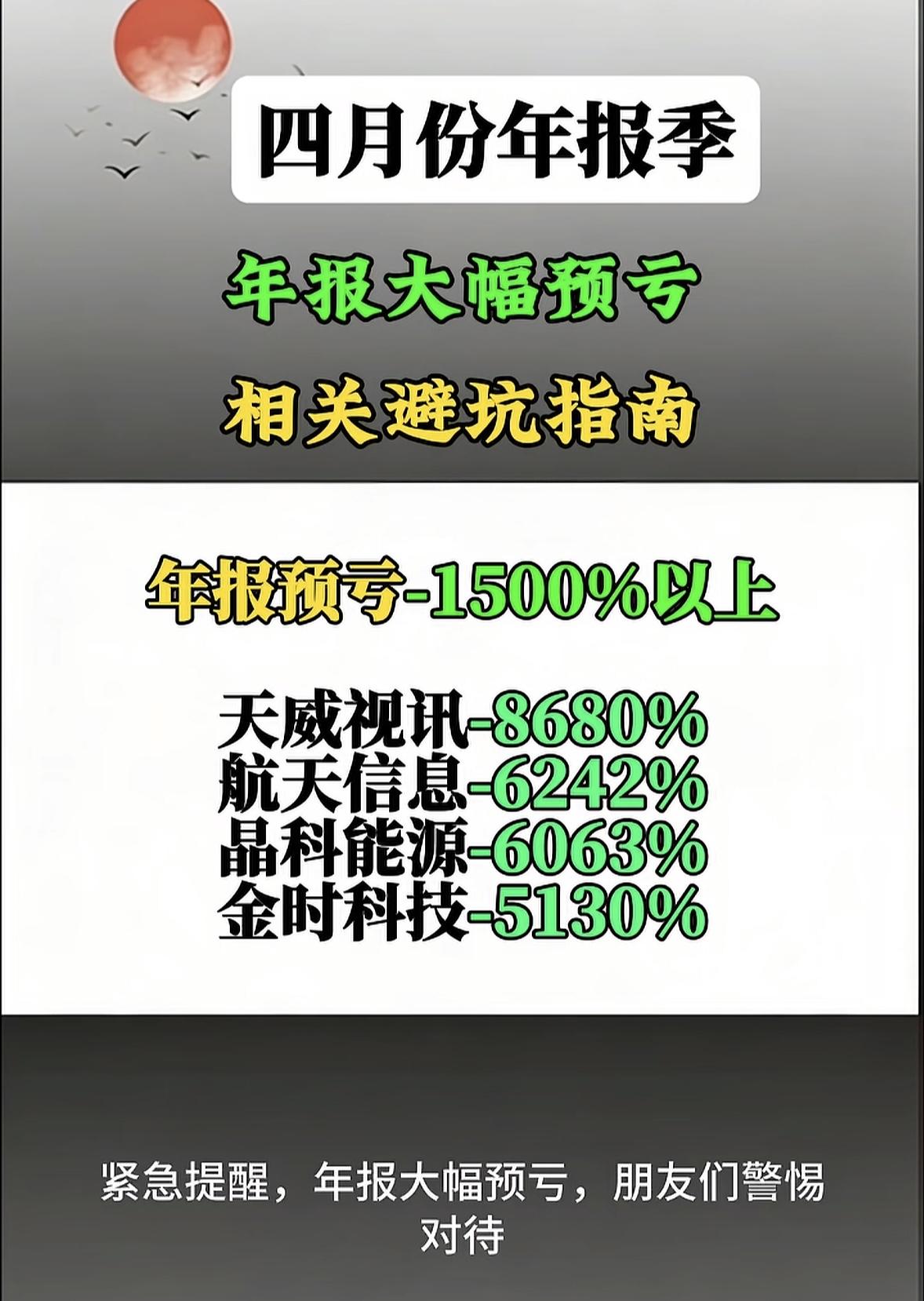2025年亏损王排行榜新鲜出炉 📉四月年报季“排雷”预警!这些公司预亏超1500%,投资者需警惕 四月年报季,市场迎来业绩“大考”,部分公司业绩“地雷”集中引爆!天威视讯预亏幅度高达8680%,航天信息、晶科能源、金时科技等紧随其后,预亏均超5000%。英飞拓、西藏城投、华神科技等也纷纷“上榜”,预亏幅度超3000%的公司达十余家。年报预亏超1500%的“重灾区”涉及科技、能源、地产、传媒等多个领域,投资者需高度警惕,理性避坑,切勿盲目“抄底”!