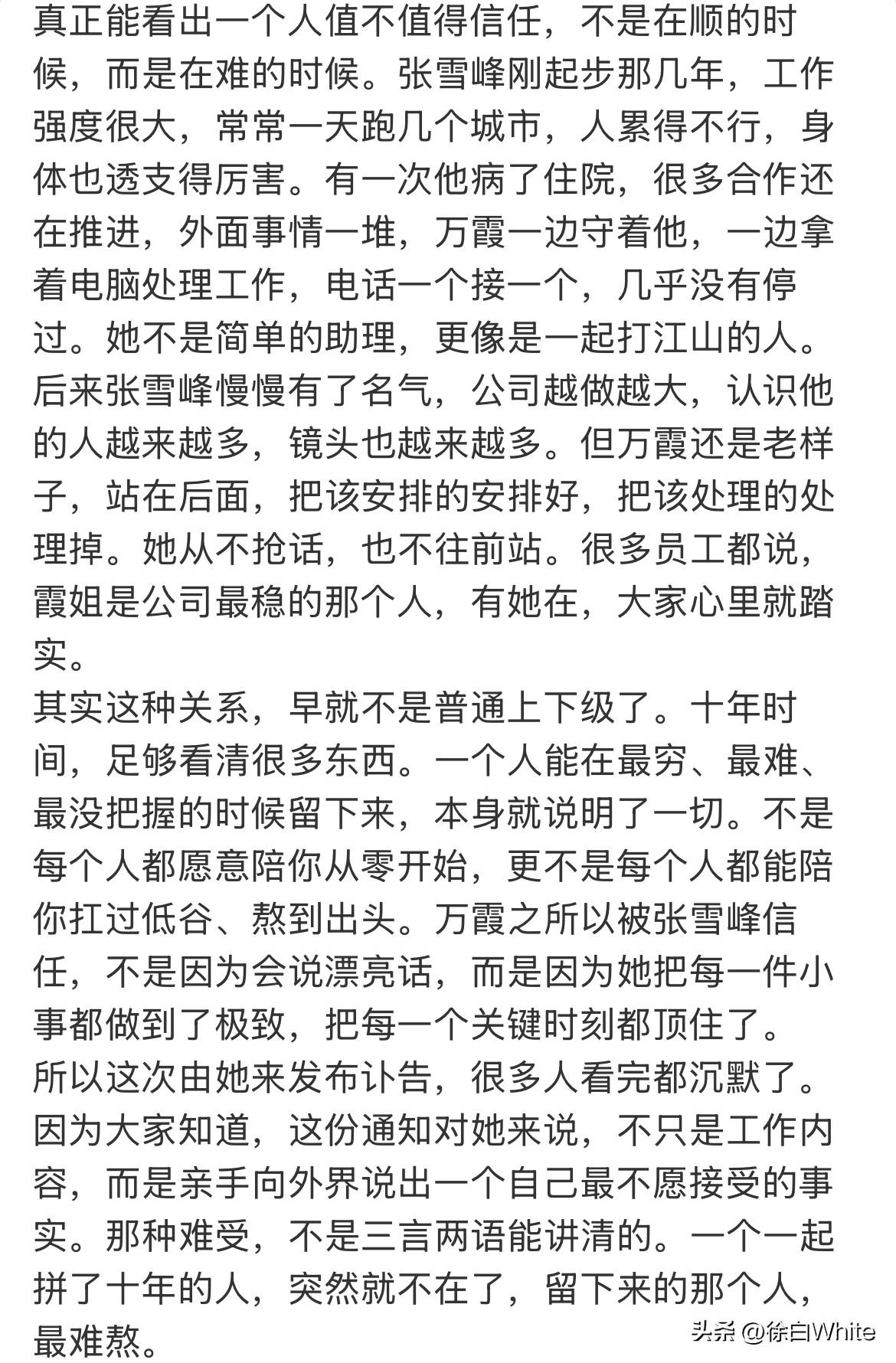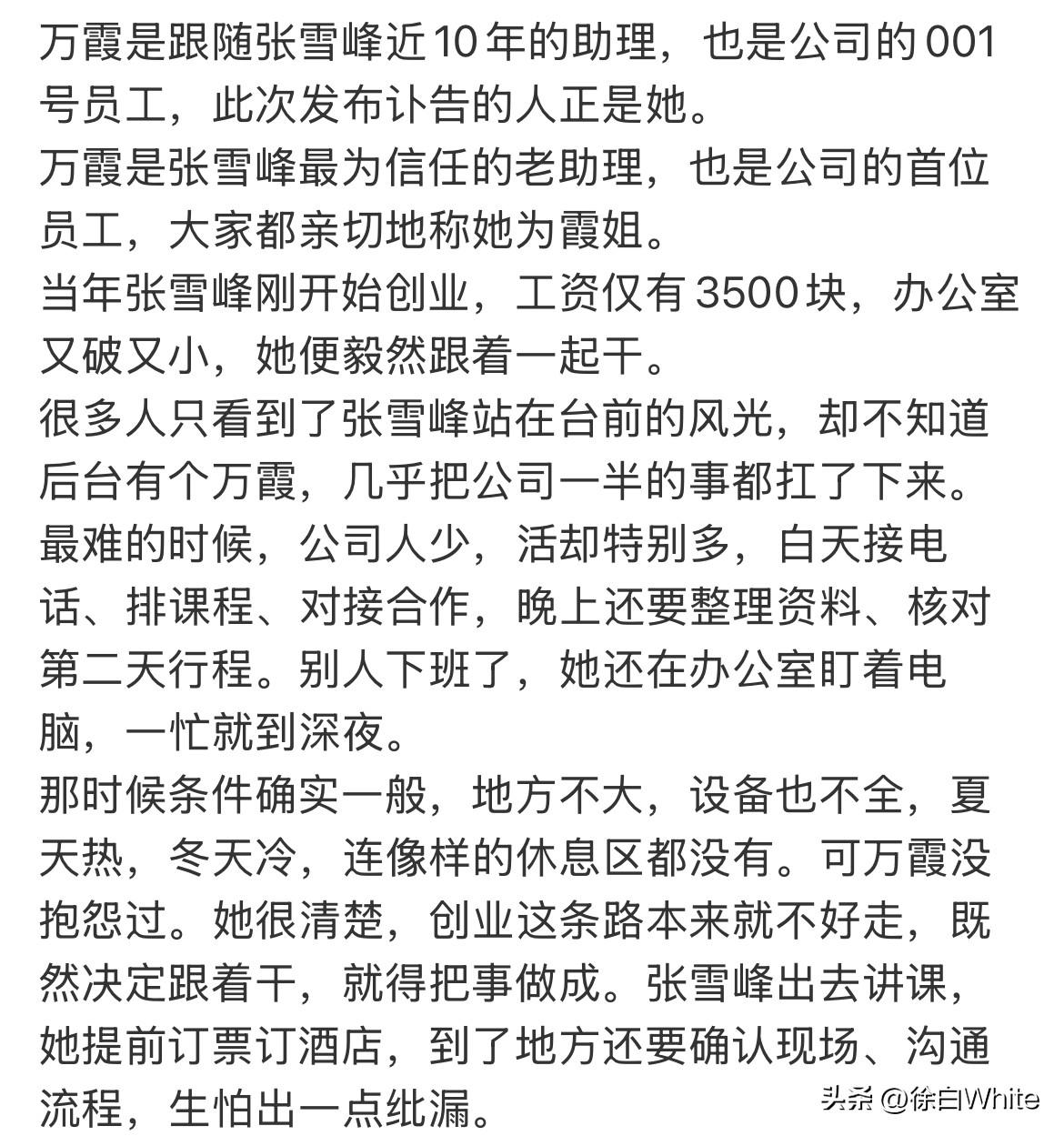 3月29日,万霞发文悼念张雪峰! 昨天为张雪峰站完最后一班岗,万霞在朋友圈发文悼念张雪峰,“告别的话我一句都说不出来,我只当今天天气很好,你终于想着休息休息,跑去旅行了,放心吧,我们一定好好争气,只是再也没人在我焦虑不安的时候跟我说,怕啥呢,这不有我呢么……” 万霞悼念的文字不长,却字字锤心,能感觉到她与张雪峰之间的情谊很深,对于张雪峰公司的未来也有了说明,会继续做下去! 最后那句……张雪峰真的是一位很好的老板!