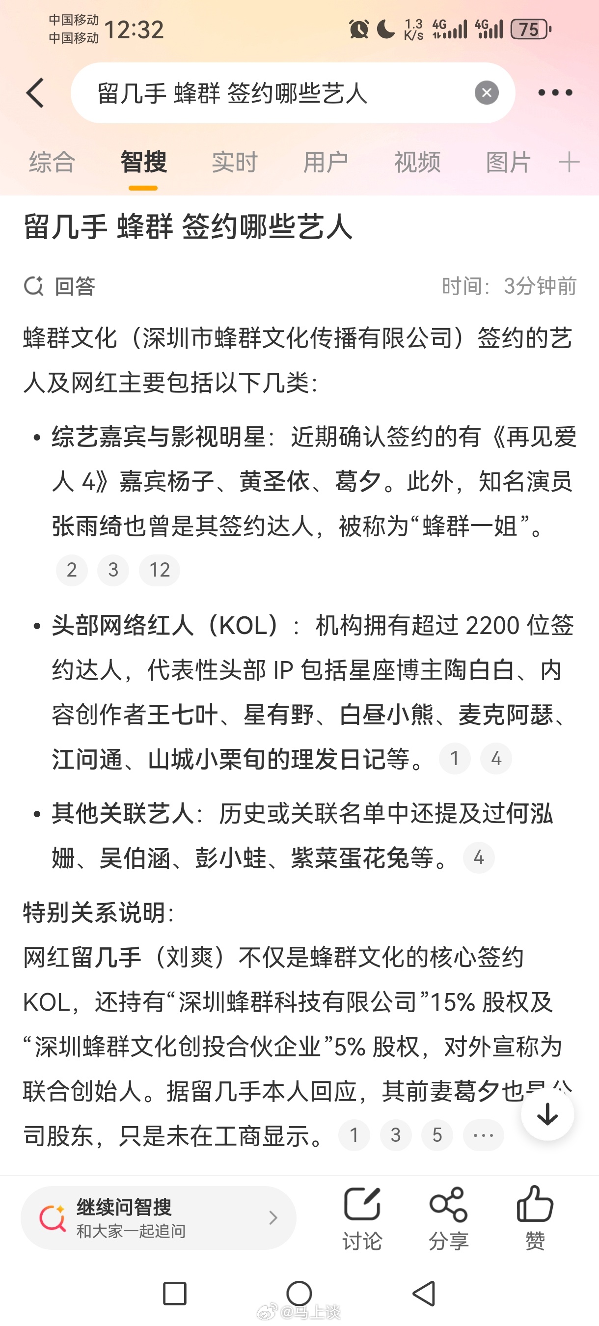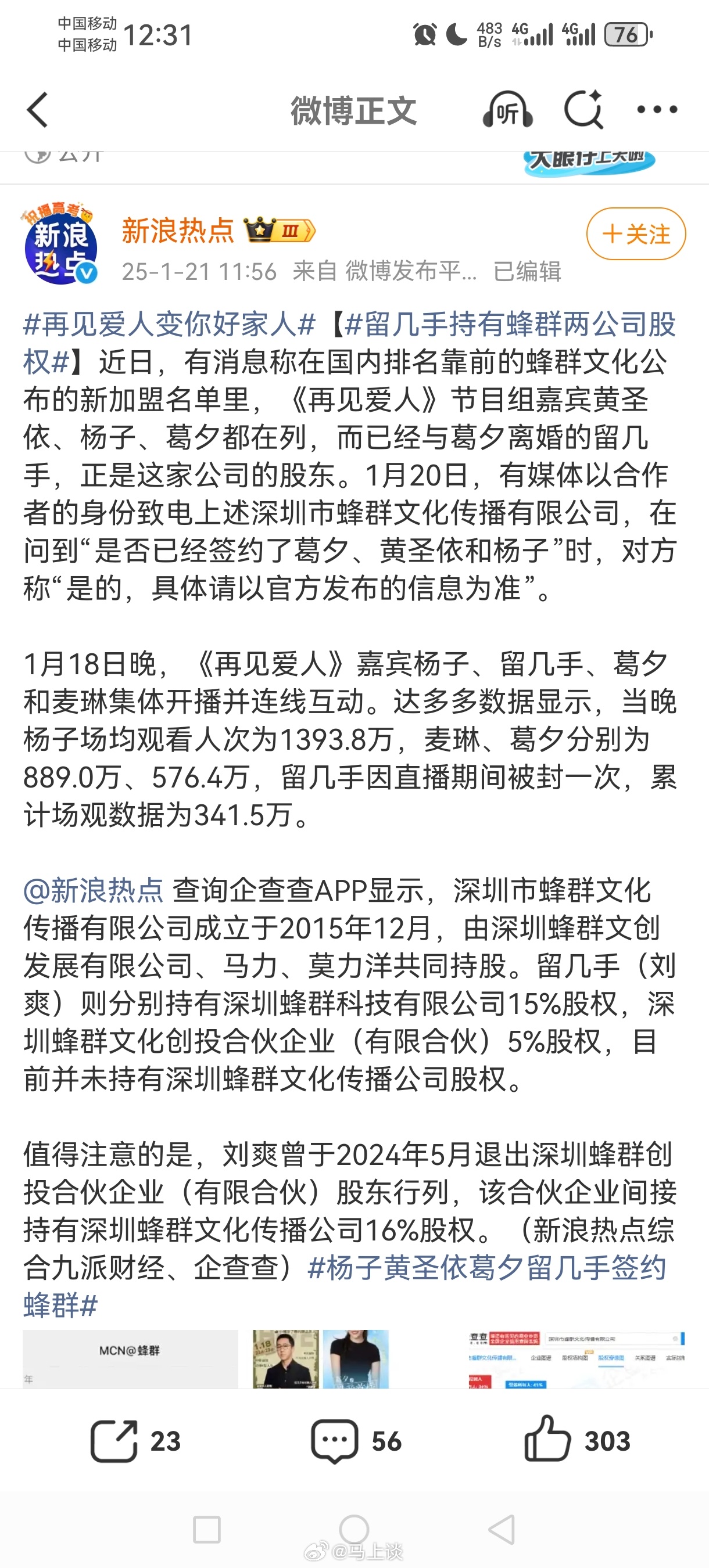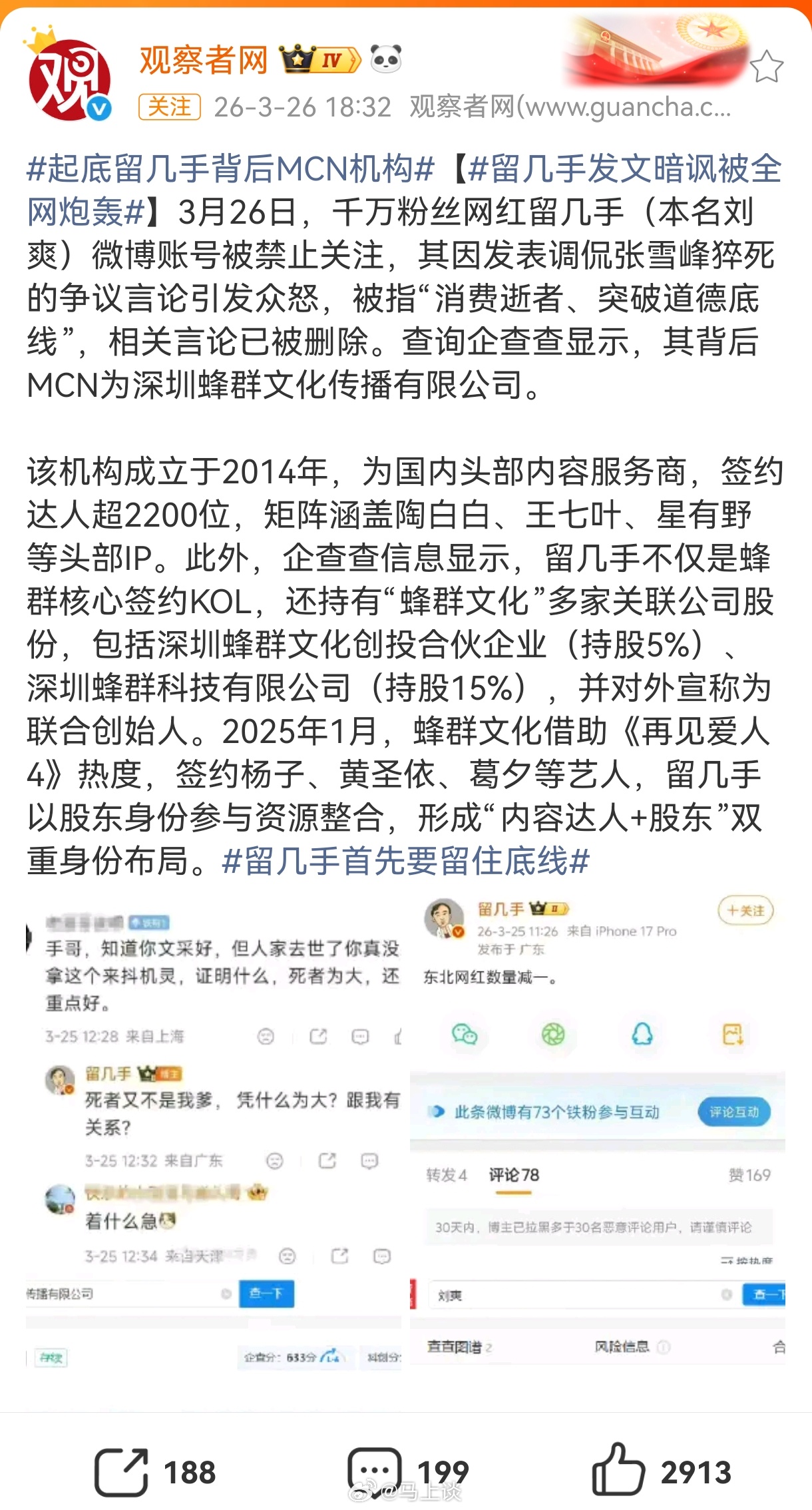 留几手因暗讽张雪峰去世惹众怒,反而带火了他的前妻葛夕。但是前去给葛夕捧场的网友可能不知道,葛夕甚至只是留几手旗下公司的一名网红…所以,我一直建议网红出问题,一定要追责背后的mcn公司和负责人。当初再见爱人几乎就是蜂群公司在背后操盘,不止留几手和葛夕属于蜂群,杨子黄圣依都签约了蜂群,炒作男女对立、撕裂家庭成那样,最后毫无处罚,不了了之…
