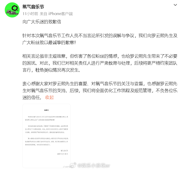 氧气音乐节道歉 氧气音乐节就工作人员不当言论所引发的误解与争议道歉:“我们向罗云熙先生及广大粉丝致以最诚挚的歉意!相关言论虽非主观故意,但伤害了各位粉丝的情感,也给罗云熙先生带来了不必要的困扰。对此,我们已对相关责任人进行严肃教育与处理,后续将更严格约束团队言行,杜绝类似情况再次发生。”