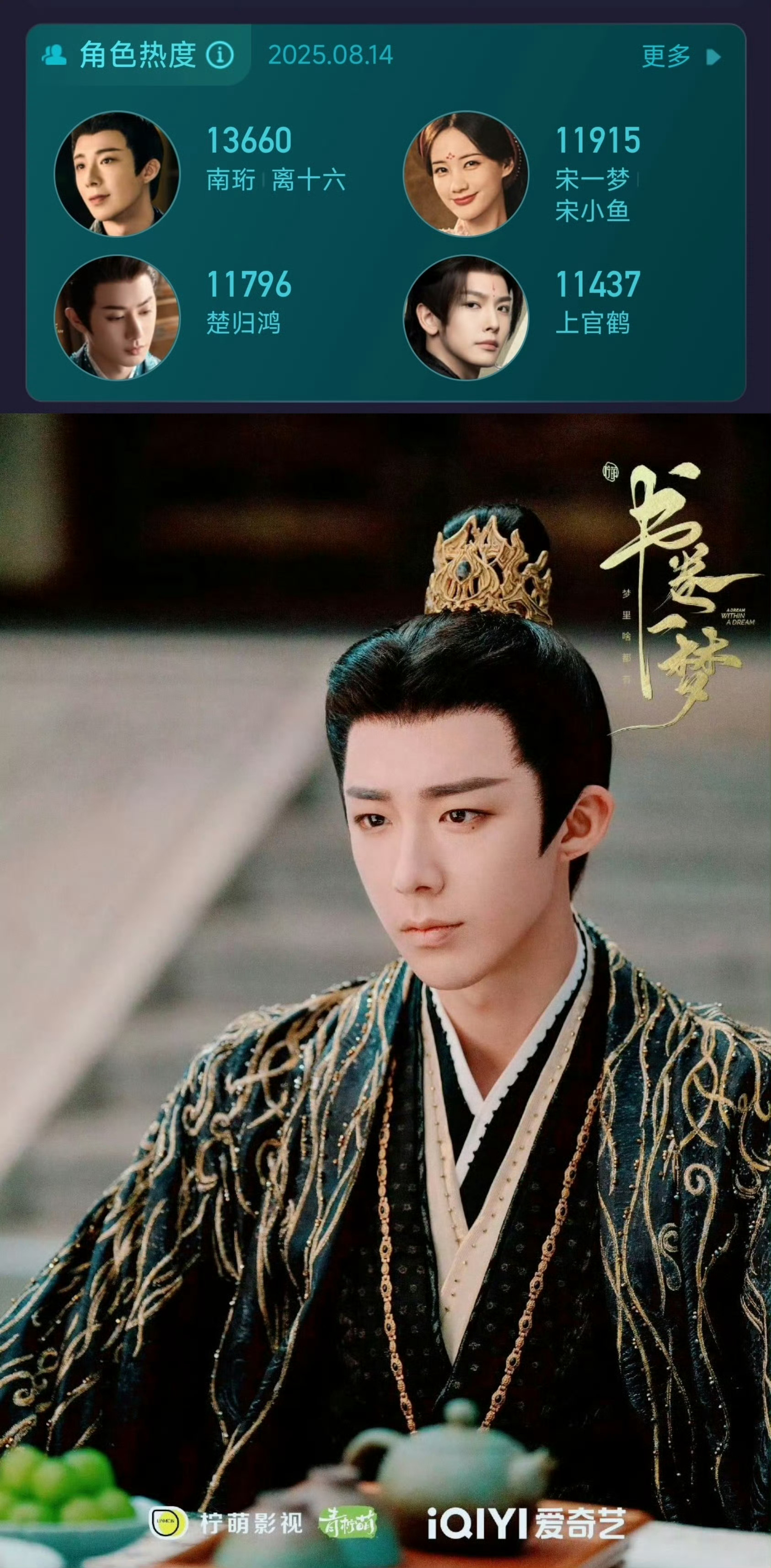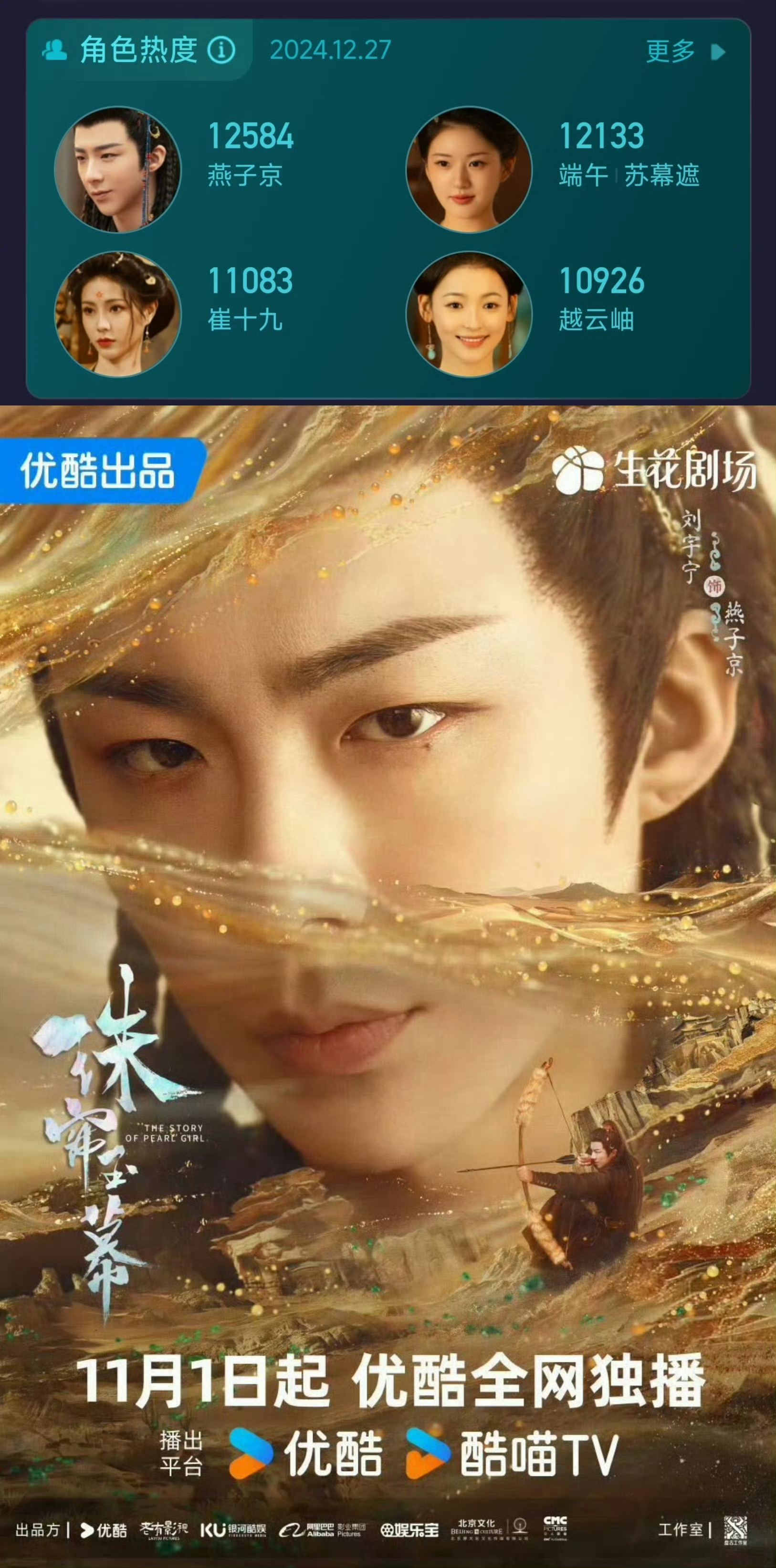 ❷《珠帘玉幕》,2024年11月1日在优酷独播,剧集开播至会员收官期间,刘宇宁的微博粉丝增长了13.3万。