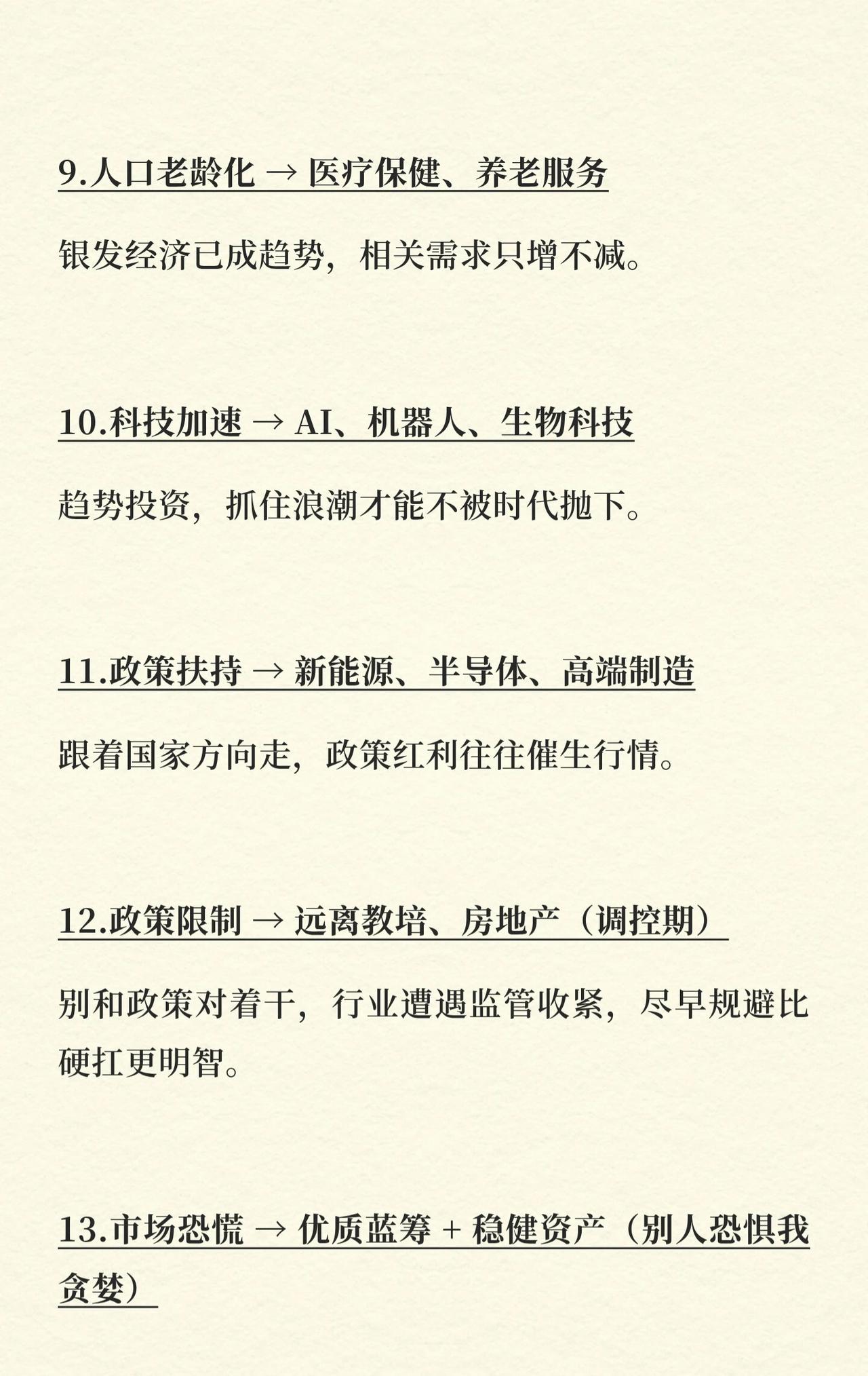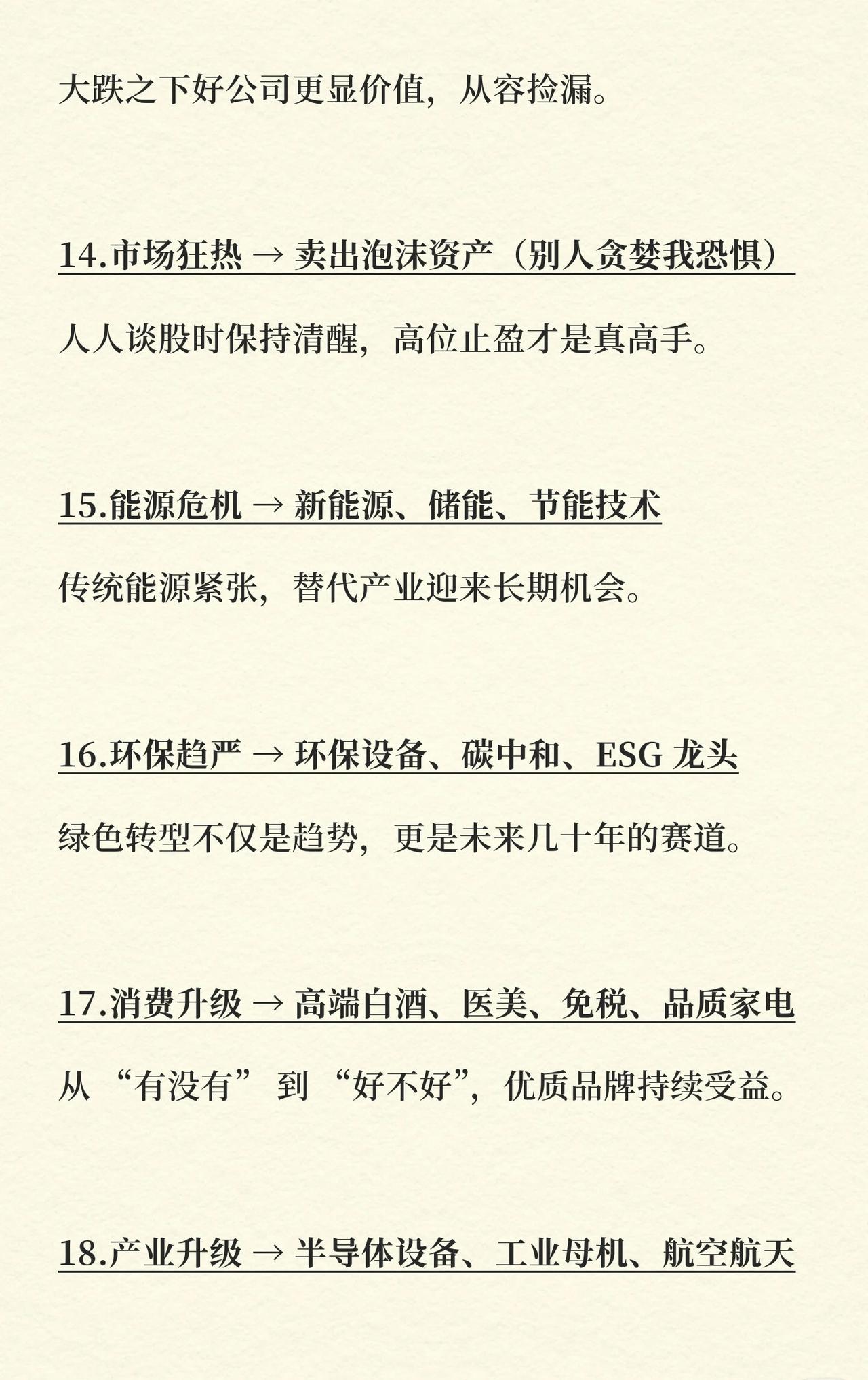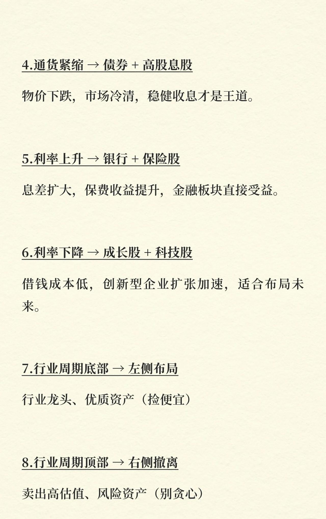 这份投资铁律围绕经济周期、利率变化、行业周期、社会趋势、政策导向、市场情绪、能源环保、消费升级、产业升级9大维度,给出18条针对性投资策略,核心是“顺周期/趋势布局,逆周期/风险规避”,具体如下: 一、经济周期维度 1. 经济下行:选黄金+煤炭。黄金避险、煤炭需求支撑,均为资金“避风港”(高股息防御)。 2. 经济上行:选消费+医药。居民消费意愿提升(消费升级)+健康刚需,带动板块业绩弹性走强。 二、利率环境维度 3. 通货膨胀:选不动产+资源股。货币贬值下,实体资产(不动产)、稀缺资源(资源股)保值增值能力强。 4. 通货紧缩:选债券+高股息股。物价下跌、市场冷清,稳健收息(债券利息、高股息分红)是核心策略。 5. 利率上升:选银行+保险股。利率上行扩大银行息差、提升保险保费收益,金融板块直接受益。 6. 利率下降:选成长股+科技股。低借贷成本加速创新企业扩张,适合布局“未来成长型”标的。 三、行业周期维度 7. 行业周期底部:左侧布局。逢低买入行业龙头、优质资产(“捡便宜”)。 8. 行业周期顶部:右侧撤离。卖出高估值、风险资产,不贪心(规避周期下行风险)。 四、社会趋势维度 9. 人口老龄化:选医疗保健、养老服务。“银发经济”成趋势,老年医疗、养老需求长期增长。 10. 科技加速:选AI、机器人、生物科技。趋势投资,抓住科技革命浪潮(不被时代抛下)。 五、政策导向维度 11. 政策扶持:选新能源、半导体、高端制造。跟紧国家方向,政策红利催生行业行情。 12. 政策限制:远离教培、房地产(调控期)。监管收紧时,尽早规避比硬扛更明智。 六、市场情绪维度 13. 市场恐慌:买优质蓝筹+稳健资产(“别人恐惧我贪婪”)。大跌后好公司价值凸显,从容捡漏。 14. 市场狂热:卖泡沫资产(“别人贪婪我恐惧”)。高位止盈,人人谈股时保持清醒。 七、能源环保维度 15. 能源危机:选新能源、储能、节能技术。传统能源紧张,替代产业(清洁能源、储能)迎长期机会。 16. 环保趋严:选环保设备、碳中和、ESG龙头。绿色转型是未来几十年赛道,政策驱动行业增长。 八、消费升级维度 17. 消费升级:选高端白酒、医美、免税、品质家电。消费从“有没有”转向“好不好”,优质品牌持续受益。 九、产业升级维度 18. 产业升级:选半导体设备、工业母机、航空航天。高端制造、科技升级驱动相关领域长期发展。 核心逻辑:投资需结合“宏观环境(经济、利率)+中观趋势(行业、政策)+微观情绪(市场、周期)”,顺势而为,规避风险,长期穿越牛熊。
