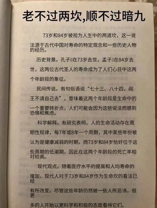 73、84——人老了有这两个“特别的坎”,如果不是“熬过”,积累才是关键,就能长寿 “两个特别的坎”,在老年医学和健康长寿研究领域确实有明确共识,它们并非民间传闻,而是被大量数据证实的关键转折点。如果能顺利跨过这两道坎,不仅预期寿命显著延长,晚年的生活质量也会有质的提升。 第一道坎——73岁左右。 这一年龄是身体机能的“断崖期”,这个年龄对应着身体系统性的衰退高峰。从40岁起肌肉每10年减少8%,70岁后流失速度翻倍。到73岁左右,很多人会经历肌少症,表现为腿脚无力、容易跌倒、握力下降,跌倒已成为65岁以上老年人受伤死亡的首位原因。免疫功能断崖式下降,胸腺基本萎缩,T细胞再生能力大幅减弱,这就是为什么很多老人“过了73岁,一场小小的感冒就能住院”。同时多病共存集中爆发高血压、糖尿病、冠心病、慢阻肺等基础病往往在这个年龄段进入并发症高发期。 第二道坎:84岁左右。 这个年龄端是失能与认知的“分水岭”,对应的是预期寿命的最后一道关口。跨过73岁的老人,如果能维持较好的功能状态,下一个关键节点就是84岁左右——此时面临的核心风险不再是单一疾病,而是失能和认知障碍。75岁后,失能发生率每5年翻一番。到84岁,约三分之一的老人存在日常活动(如洗澡、穿衣、如厕)需要他人帮助的情况。阿尔茨海默病等神经退行性疾病的发病率在85岁前后达到高峰。一旦出现认知下降,跌倒、营养不良、感染等连锁风险都会成倍增加。 73、84这两道坎能“熬过”的前提,是在65-70岁之间打下了良好的基础。很多老人觉得“年纪大了,不用折腾了”,但实际上,70岁之前的健康投资回报率最高——肌肉还能练回来,认知储备还能积累,慢性病还能稳定控制。等到73岁之后再想“临时抱佛脚”,往往事倍功半。73岁和84岁这两个节点,本质上是身体给我们的两次“大考”。能顺利通过的人,往往不是因为基因特别好,而是因为提前做到了——知道这两个坎的存在,提前布局,保住肌肉、吃够蛋白、坚持活动、预防跌倒,充分利用家庭、社区、医疗资源形成合力。所以长寿从来不是靠“熬”出来的,而是靠一次次的主动选择积累出来的。如果你或家人正处于这两个年龄附近,不妨对照看一下,现在开始调整,一点都不晚。