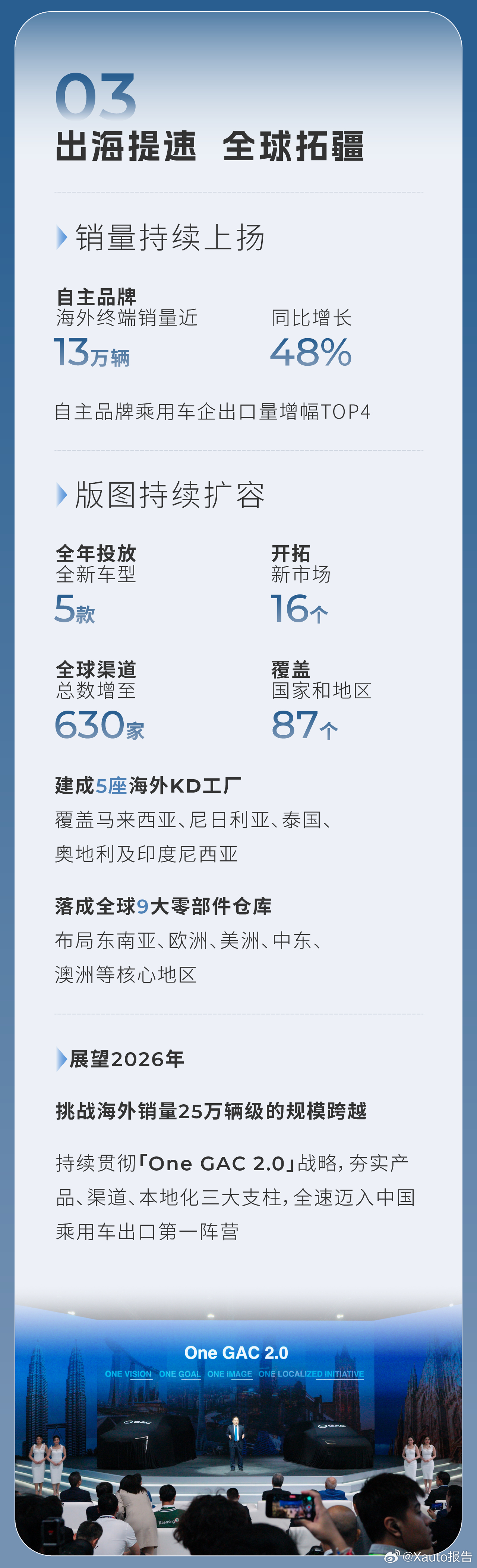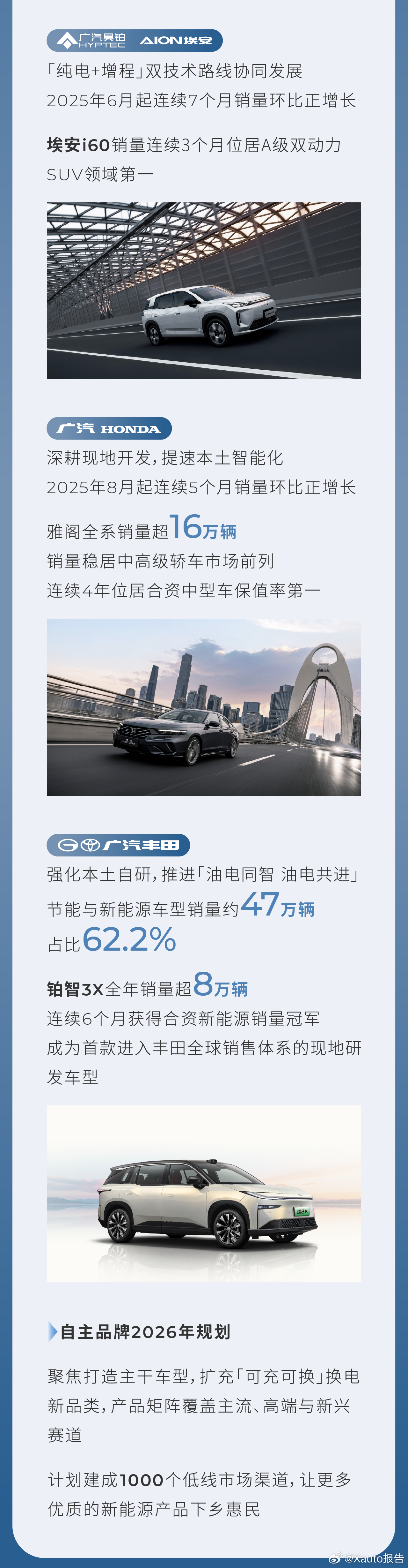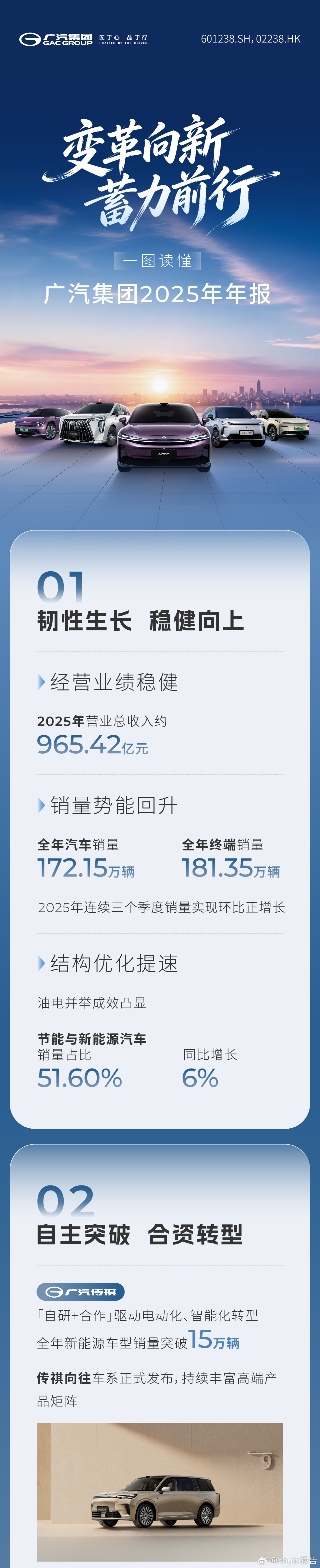 一图读懂广汽集团2025年年报2025年广汽集团营收965.42亿元,同比下滑,归母净利润亏损87.84亿元。全年销量172.15万辆,节能与新能源车占比首超50%,海外销量近13万辆,同比增长48%。汽场全开广汽集团2025年营收965.42亿元广汽集团