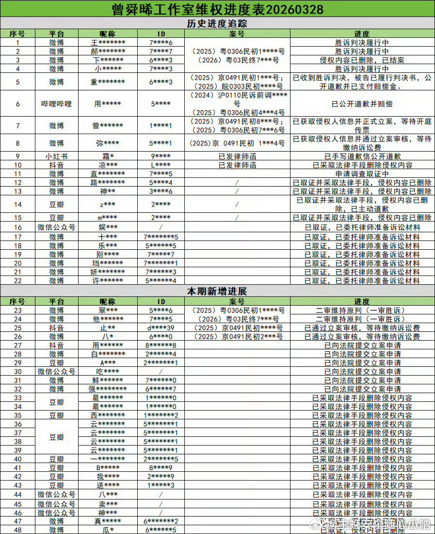曾舜晞维权案件进展表更新,vb 、字母站、🍠、逗音、逗瓣、公众号…全平台告嘿