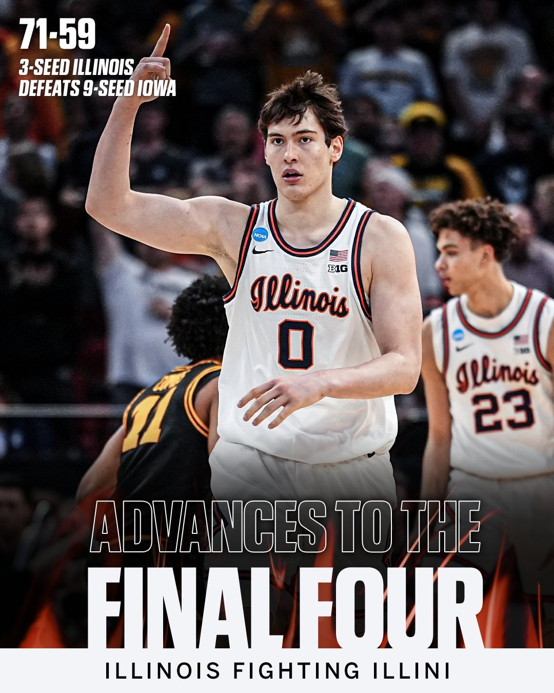 伊利诺伊战胜爱荷华,21年来首次闯进最终四强,瓦格勒17中8拿到25分3助攻,小佩贾17分5篮板。NCAA