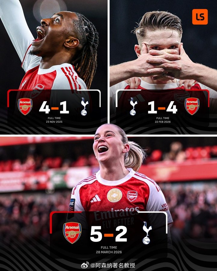 男足赛场,在2025年11月24日的交锋中,阿森纳以4-1击败热刺,埃泽完成帽子戏法;2026年2月阿森纳客场再度4-1击败热刺。