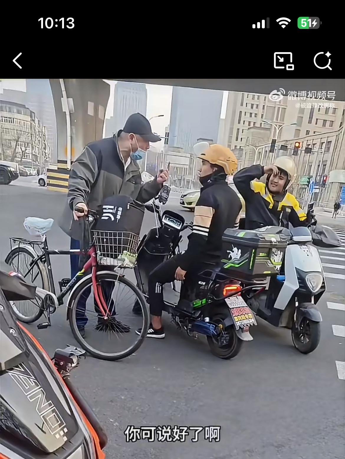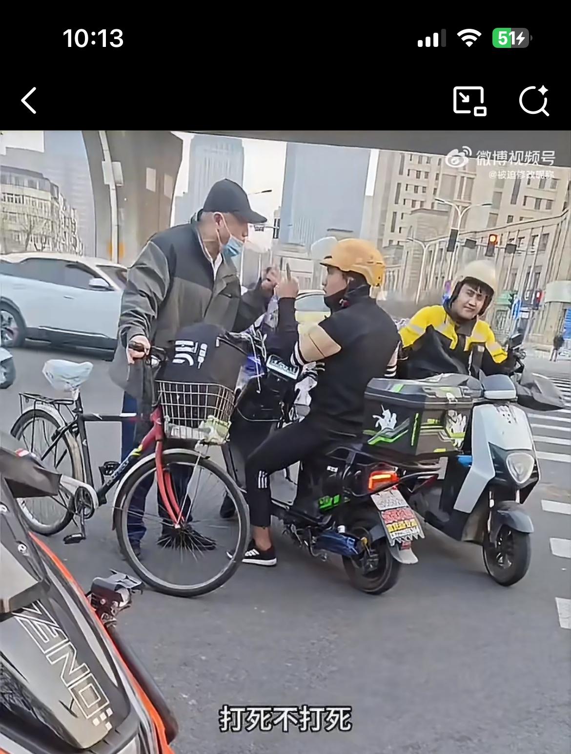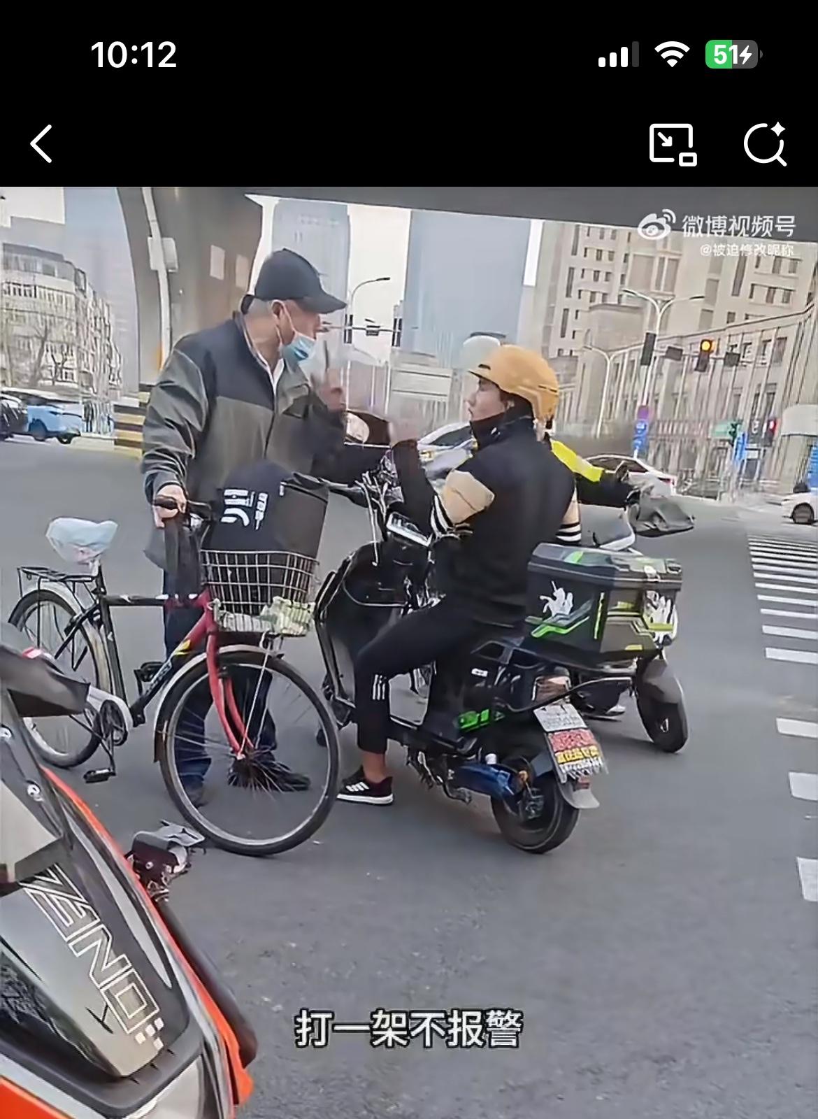 天津大爷骑车和外卖小哥发生冲突,发狠要和外卖小哥单挑,说咱们打一架,不报警,打死