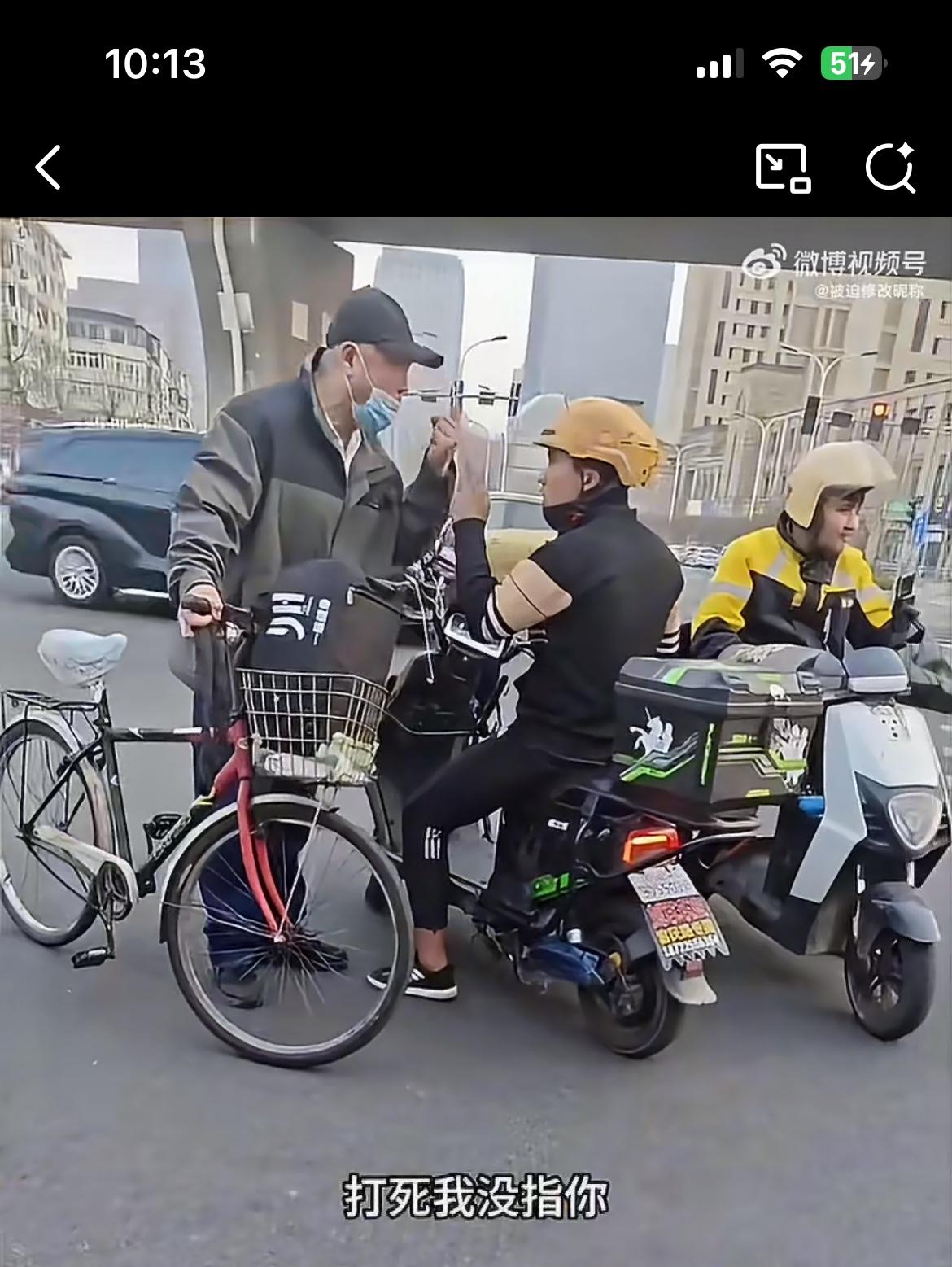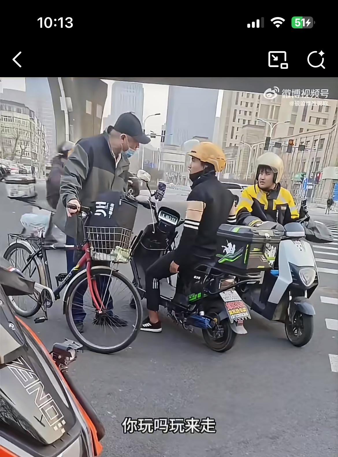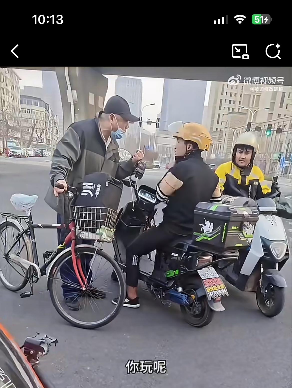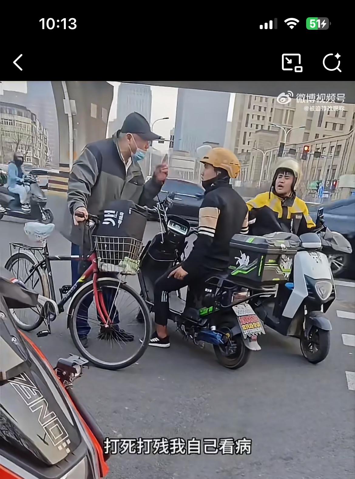 天津大爷骑车和外卖小哥发生冲突,发狠要和外卖小哥单挑,说咱们打一架,不报警,打死