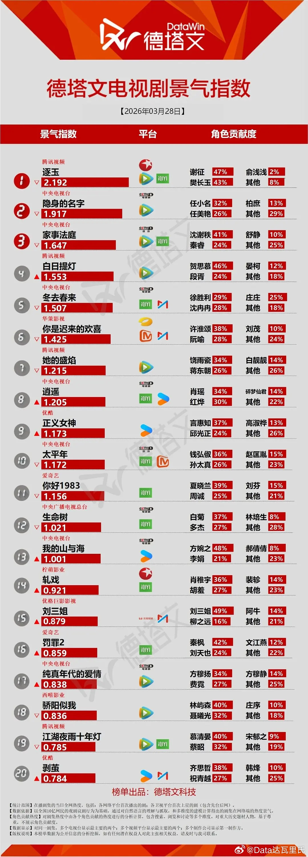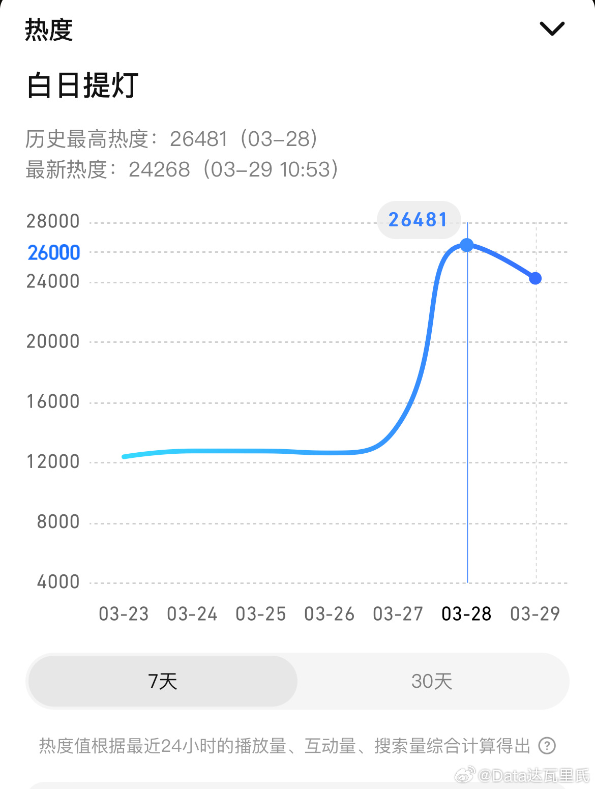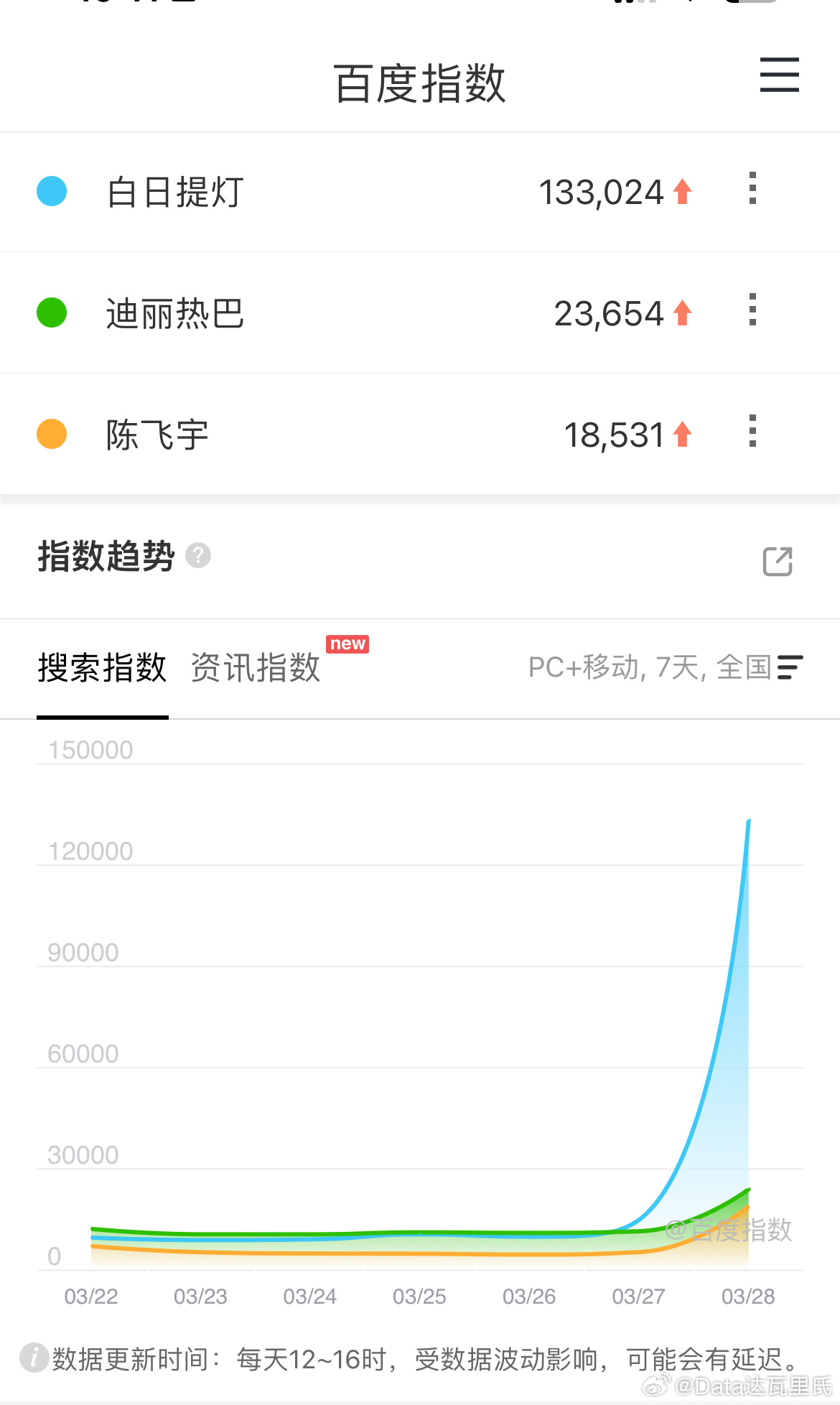 白日提灯首日百指13万首日挺不错的,次日能上20万就是真的好!迪丽热巴首日2.4万,陈飞宇1.9w抖指暂时还没出V榜首日82+,首日上80是挺不错的V榜个人迪丽热巴贺思慕直接破9登顶!陈飞宇8.29~德塔文景气指数首日1.5+,讨论度还不错
