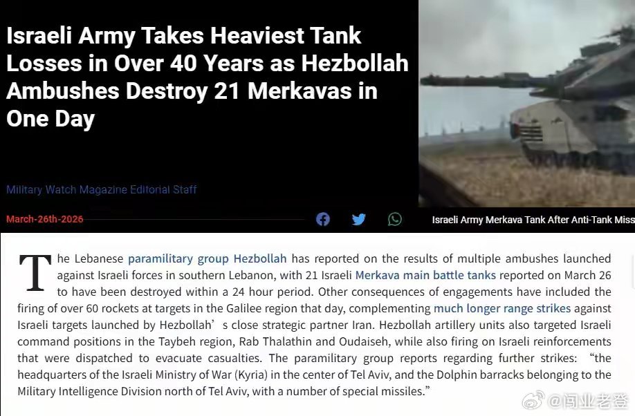 在以色列发起对黎巴嫩的大规模地面攻势后,局面并没有像前者想象的那样一帆风顺。日前,美国“Military Watch”网站援引多方数据,称黎巴嫩真主党以FPV无人机、反坦克导弹为主的反击,取得巨大成功,在24小时内消灭了21台“梅卡瓦”,这是以色列装甲部队40多年来遭遇的最惨重损失。▲以色列在黎巴嫩方向的损失确实不小在“Military Watch”网站看来,以色列装甲力量遭遇如此惨重的损失,主要是因为对先进FPV无人机缺乏认知,仍然按照之前对抗传统反坦克装备的模式应战。此外,黎巴嫩真主党调往边境的拉德万特种部队,也确实展示了远超普通部队的精锐战术水平。而以色列总参谋长扎米尔在近期对内阁的报告中,也提到由于多年反复征召预备役,人员非常疲惫,其中甚至有被征召六次,甚至是七次的情况,“常规部队已濒临崩溃”。这一点也得到了以色列反对党领袖拉皮德的证实,其认为当前同时对伊朗、黎巴嫩和加沙的作战行动,远超军队承受能力。▲FPV无人机对缺乏防备的坦克确实伤害很大作为印证,黎巴嫩真主党的最新战报,是在前线消灭了29台“梅卡瓦”。社交媒体上也确实出现了,光纤制导FPV无人机从侧、后方命中“梅卡瓦”的多个视频,还有操作伊朗“阿尔玛斯”光纤反坦克导弹(据说是仿制以色列“长钉”),成功命中的例子。此外,疑似来自拉德万的精锐反坦克小组,在坎塔拉地区打出了非常精彩的战例。伏击部队先是精准敲掉了当头开路的推土机,然后使用反坦克导弹“点名”4台“梅卡瓦”。第二梯队的4台“梅卡瓦”按照正常战术,在释放烟雾后试图冲上来抢救伤员,结果也被一一打掉。不死心的以色列装甲部队再次尝试进攻,最终在又损失2台“梅卡瓦”后选择撤退。▲黎巴嫩真主党的宣传手段还不错尽管这种一次性击毁10台“梅卡瓦”的例子绝无仅有,但也能反映当前,掌握新战术的黎巴嫩真主党精锐武装,对长期疲劳作战的以色列装甲部队的压制。不过,目前能看到的证据,还不足以彻底证实以色列遭受了这种程度的损失——黎巴嫩真主党放出的很多视频,都只是命中而非摧毁,而哪怕在俄乌战场上,也很少出现FPV无人机直接摧毁坦克的情况。双方主要还是通过无人机反复攻击,将坦克击伤,再使用远程火力或反坦克导弹彻底破坏。▲丧失机动性的坦克只能任人宰割在以色列彻底掌握制空权,武装直升机规模也不俗的情况下,黎巴嫩真主党操作无人机,远程命中甚至击伤坦克并不困难,但冒着巨大风险接近彻底摧毁,难度就比较大了。当然,相比于以往以色列装甲部队节节推进,守方往往只有在付出巨大代价后,才能获得些许战果的情况,这已经是巨大的胜利。毕竟以色列向黎巴嫩进军的目标,是解除北方威胁以集中资源应战伊朗,而实际上却是被迫将更多资源,用于针对黎巴嫩真主党的战事中,属于本末倒置。▲伊朗弹道导弹可还在工作呢2024年,以色列通过高密度投掷钻地特种炸弹的方式,“斩首”了黎巴嫩真主党绝大多数高层后,外界一度认为后者短时间内难以恢复元气,以色列也确实得以集中力量进攻伊朗。然而,包括拉德万在内的核心力量,虽然损失了大量高层,但中、基层骨干架构依然完好,叠加俄乌战场先进战术和武器外溢,在伊朗悄然支持下,最终打出远超以色列预计的战斗力,令人刮目相看。▲以色列战后面临的局面将非常糟糕以色列这几年原本很顺利,不仅基本解决了加沙问题,还实质性消灭了叙利亚的侧面威胁,更通过“十二日战争”重创了伊朗。站在2026年初,以色列表面上距离自己梦寐以求的结局,只剩下对伊朗的最后一步。然而,一场鲁莽的战争,让美以认识到伊朗革命卫队的真正战斗力,甚至同样焕发活力的黎巴嫩真主党武装,也表现出非比寻常的水平。以色列的梦,碎了。