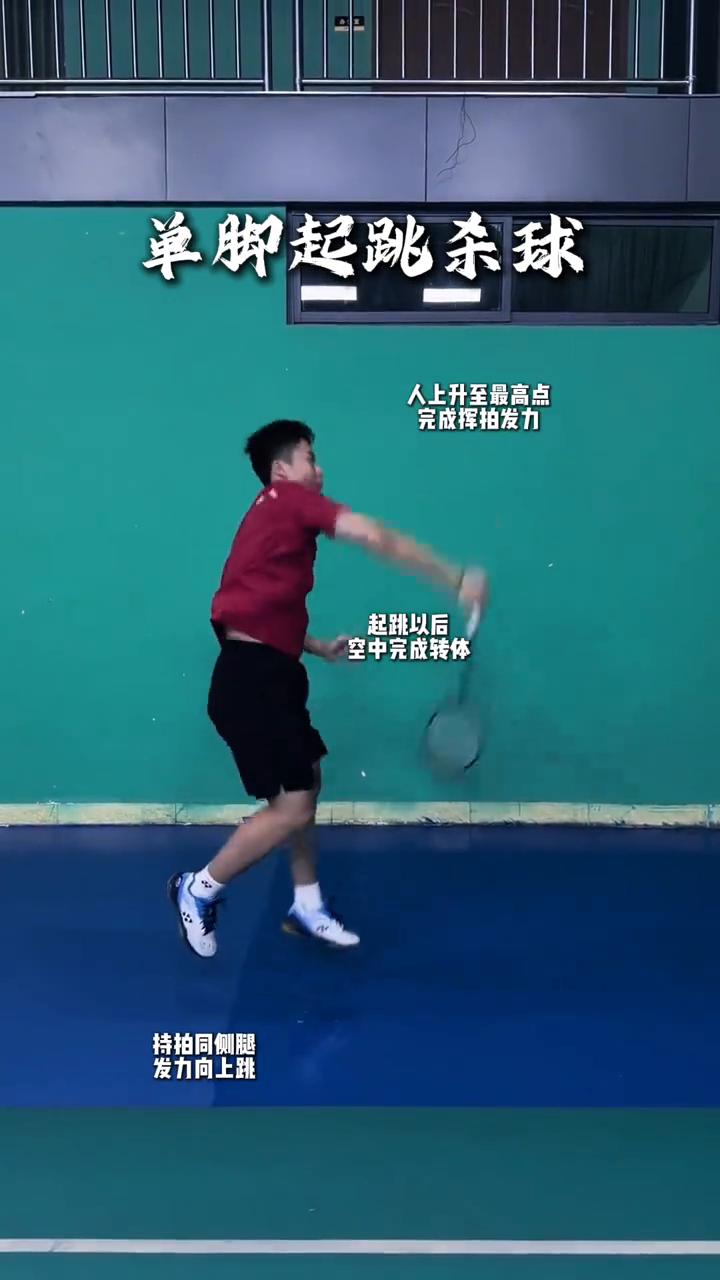 后场杀球的三种形态。 ·原地杀球:持拍手略低,另一支脚后跟抬起,在持拍手同侧腿顺势下摆,脚后跟下踩,脚后跟抬起,手臂最快速度下拉,腰腹同时下收发力。完成挥拍后重心完全在持拍对侧脚。 ·单脚起跳杀球:固定不变,对侧腿完全抬起,蓄力起跳,持拍手同侧脚支撑,人上升至最高点,完成挥拍发力,完成转体挥拍结束。 ·单腿落地:双脚起跳杀球,对侧腿后拉,缩短间距,双腿同时向下半蹲,蓄力准备起跳,半蹲向上跳,起跳空中收腿展腹,落地支撑,大步向前跨。