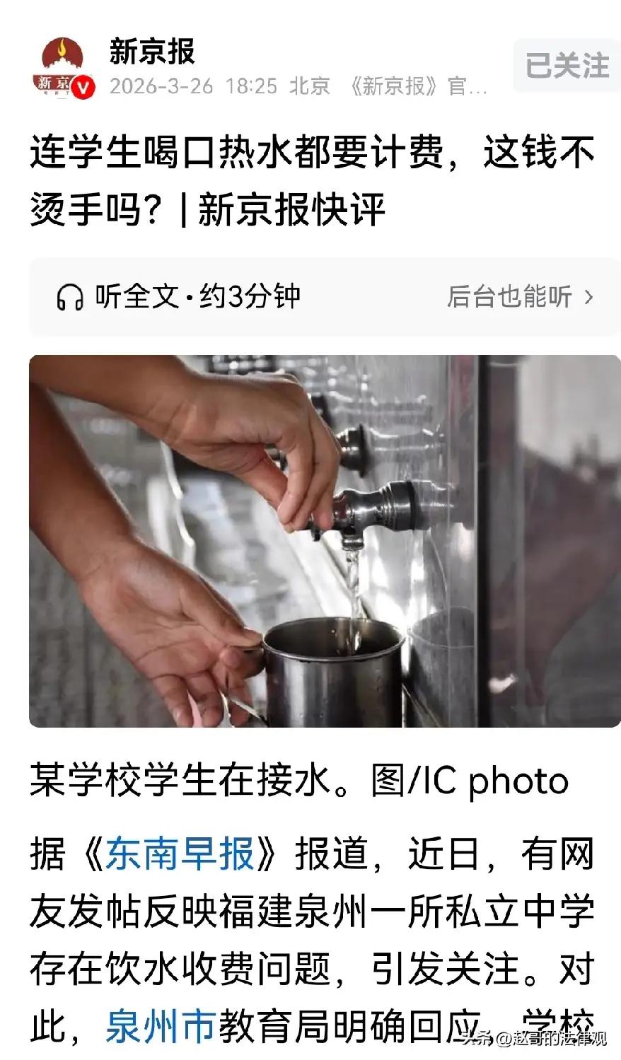 热水收费:教育的良心,岂能按流量计费? 今儿咱们单说一桩发生在福建泉州校园里的“荒诞剧”。这事儿,听着像“天方夜谭”,实则是一记狠狠抽在教育脸上的“响亮耳光”。交了不菲的学费,孩子想喝口热水,竟得先往卡里充钱!以前的开水桶没了,换成了“自来水加热器”,充50元只能用40元,还有20%的“手续费”。这哪是“教书育人”?分明是“开门做生意”,连学生那点儿喝水钱都要“雁过拔毛”,这吃相,未免太难看了! 想当年,咱们总觉得“学校是净土”,是教书育人的神圣殿堂。可如今倒好,连喝口热水都要“明码标价”,还得看第三方公司的“脸色”。学校两手一摊:“这是第三方运营,喝不喝自愿。”好一个“自愿”!校园是个相对封闭的圈子,孩子除了买卡,难道还能自己背个锅炉上学?这分明是“霸王条款”,是变相的“强制消费”。教育若是变成了“生意”,那老师的教鞭,怕是也要沾上铜臭味了。 但这“愤怒”的背后,藏着的正是咱们今天要说的“大健康”格局。真正的健康,讲究“内外双调”。外在,咱们得学会“捍卫权益”,别让那“忍气吞声”成了孩子的“心理阴影”,一杯热水虽小,折射的却是教育的温度;内在,这“感恩之心”更是不可或缺。我们要感恩这“舆论的监督”,是它让那些“隐形的手”无处遁形;更要感恩这“教育的底线”,它让我们明白,无论时代如何变迁,公益的初心不能变,育人的本质不能丢。这种“较真”的勇气,才是滋养社会肌体的“灵丹妙药”。 我们要感恩这“时代的清醒”,它虽带着阵痛,却让我们在一次次追问中,守护着教育的尊严。 愿世间少一些“唯利是图”的算计,多一些“春风化雨”的温情。 愿你我皆安康,前程皆似锦! 校园热水收费