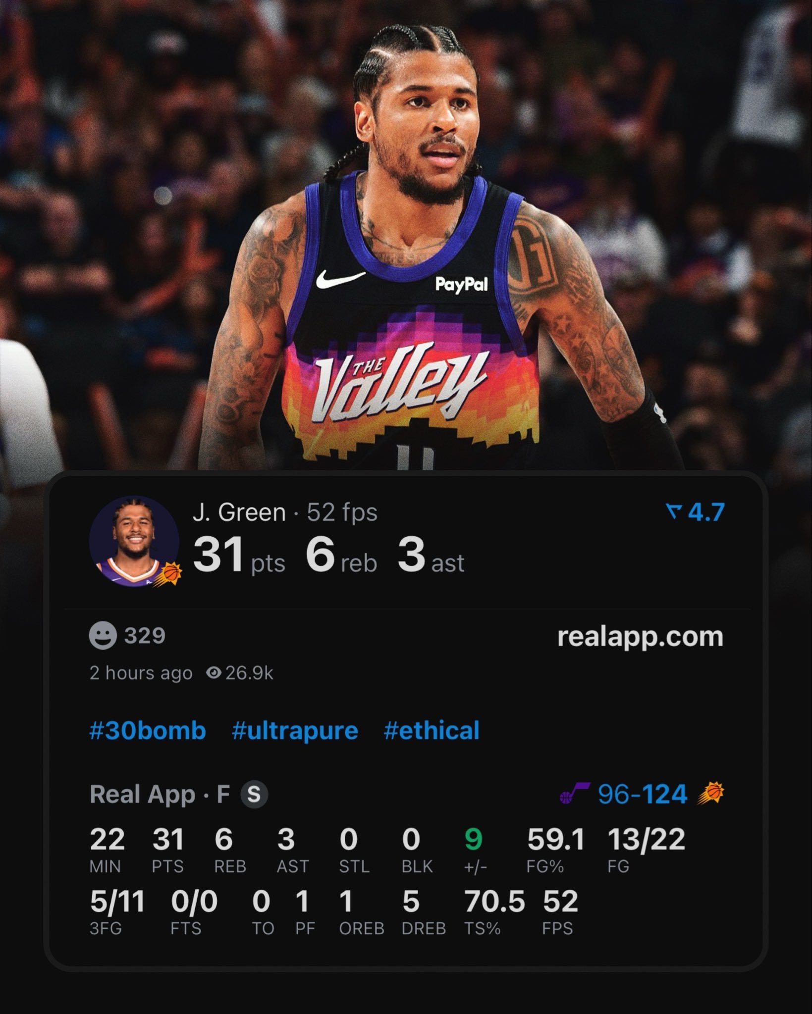 杰伦·格林出战22分07秒得到31分,太阳队史单场出场时间最短的30+。