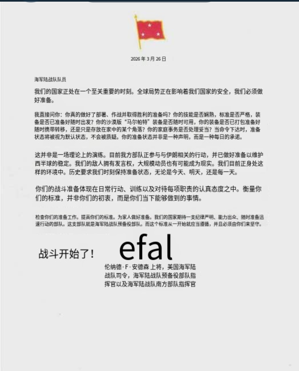 美国海军陆战队预备役部队司令伦纳德·F·安德森的一封信,指示美国海军陆战队预备役人员在与伊朗相关的行动中审查战备状态,警告称大规模动员“可能成为现实”。热点观点美伊以冲突美军为在伊朗数周地面行动做准备