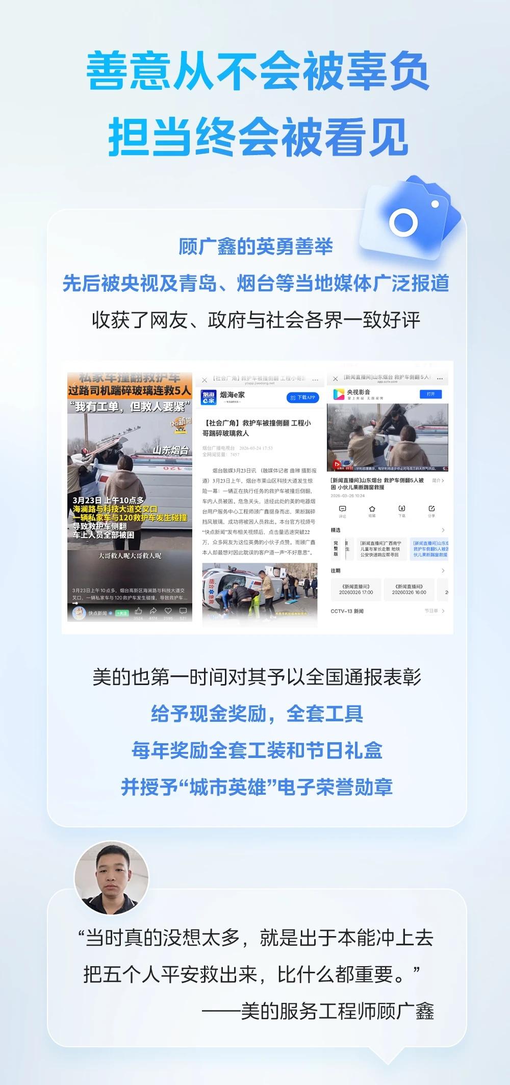 一句“救人要紧”,美的工程师用行动诠释担当 一句“救人要紧”,温暖人心。 一次挺身而出,彰显担当。 美的服务工程师顾广鑫,让我们看见平凡人身上的光。 从服务千家万户到守护身边平安, 美的始终与社会同心,与善意同行💗 美的全屋智能 一声小美生活更美 美的美的服务正能量英雄暖心瞬间感动瞬间