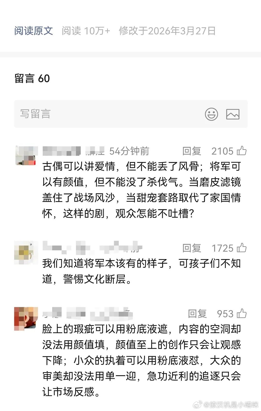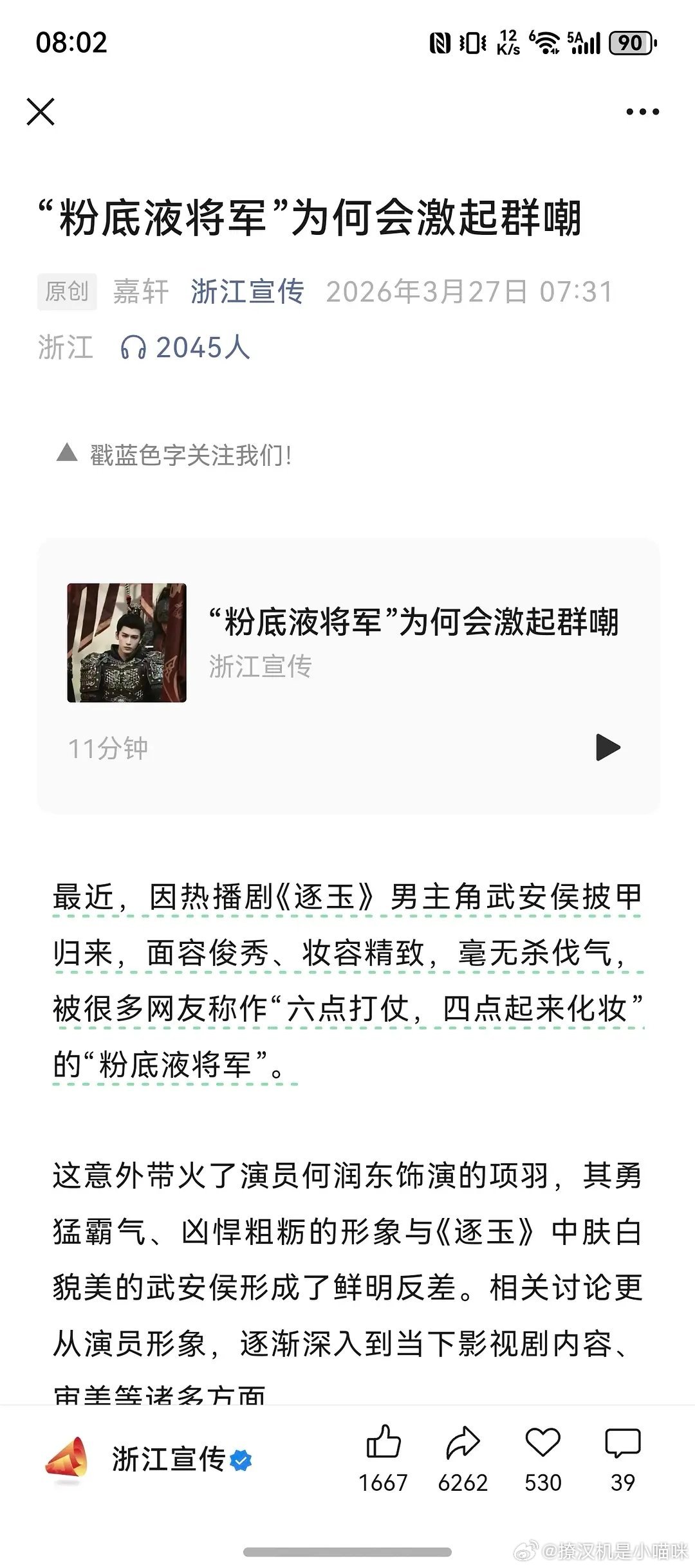 没必要发明粉底液将军这样恶毒的词张凌赫在学校的时候就说过讨厌“小鲜肉模式”,结果《逐玉》里的武安侯还是被骂成“粉底液将军”,这锅该演员背吗?有人说粉底液将军是厌女,拿化妆品踩男性气概;有人说化妆自由,骂人才是刻板印象。但吵到最后,没人问一句:为什么将军的脸,比他的刀还干净?解放军官号都下场怼“话语权不是粉底液涂出来的”,戳破的就是影视圈的遮羞布:为了流量,把金戈铁马的武将,磨成纤尘不染的古偶摆件;为了颜值,牺牲角色逻辑,消解武将风骨,让“俊美”变成了“没杀气”的代名词。粉丝别洗“贴合原著”,原著要的是面若冷玉的将军,不是战场补妆的爱豆;别拿“厌女”当挡箭牌,观众骂的从来不是“他化妆了”,是他除了脸,什么都没演出来;更别让演员背锅——张凌赫本人都在反抗“小鲜肉模式”,是谁把他塞进了这个“只有粉底液、没有杀伐气”的剧本里?是资本逐利的审美绑架?是宣发只会炒颜值的懒惰?还是编剧把家国情怀换成了甜宠套路的投机?“粉底液将军”不是骂演员,是骂整个行业:当将军的妆容比战术更精致,当演员的脸比剧情更有记忆点,这才是最该被钉在耻辱柱上的事。你觉得“粉底液将军”的锅,该资本背?编剧背?还是宣发背?评论区站队!