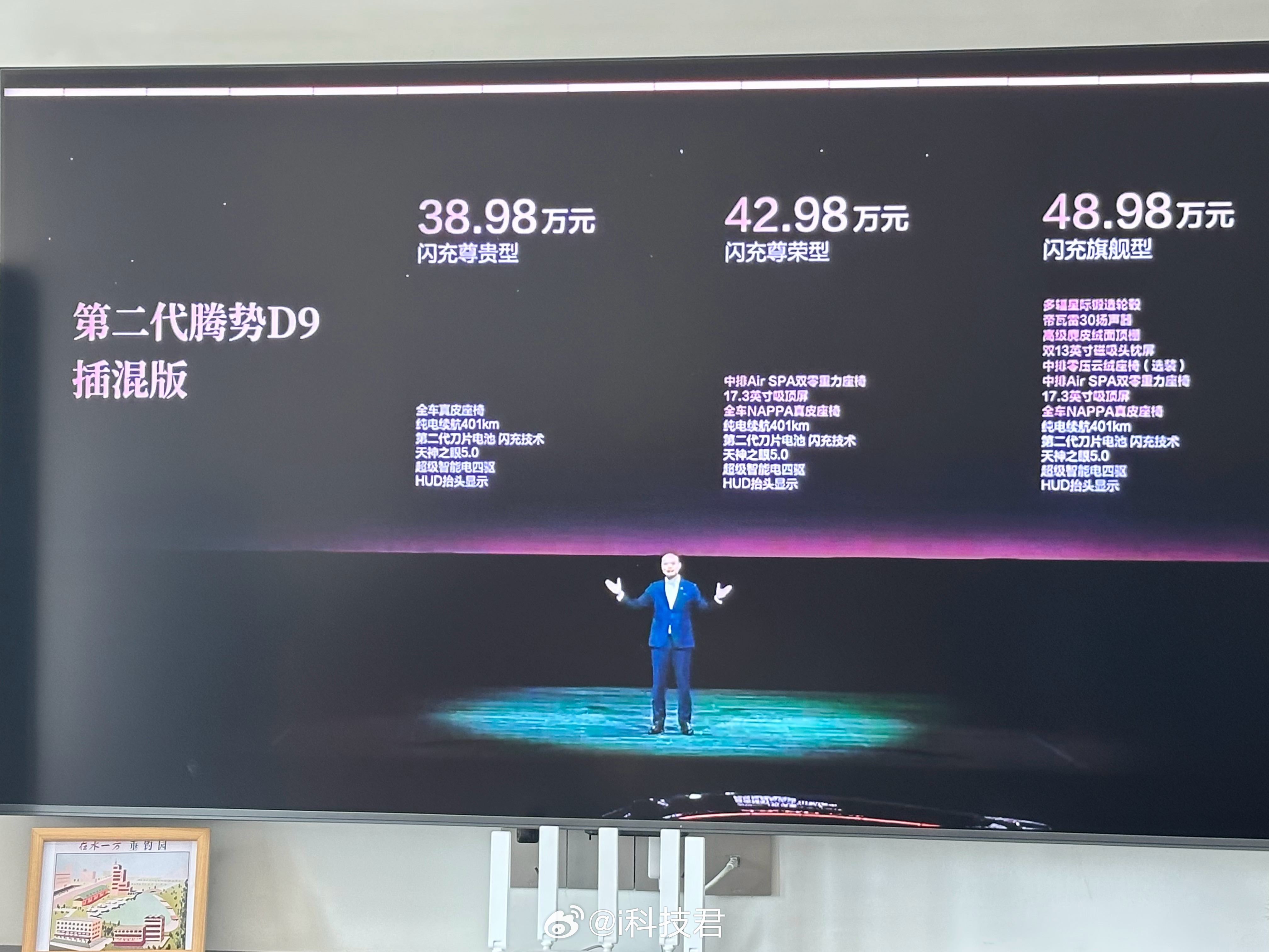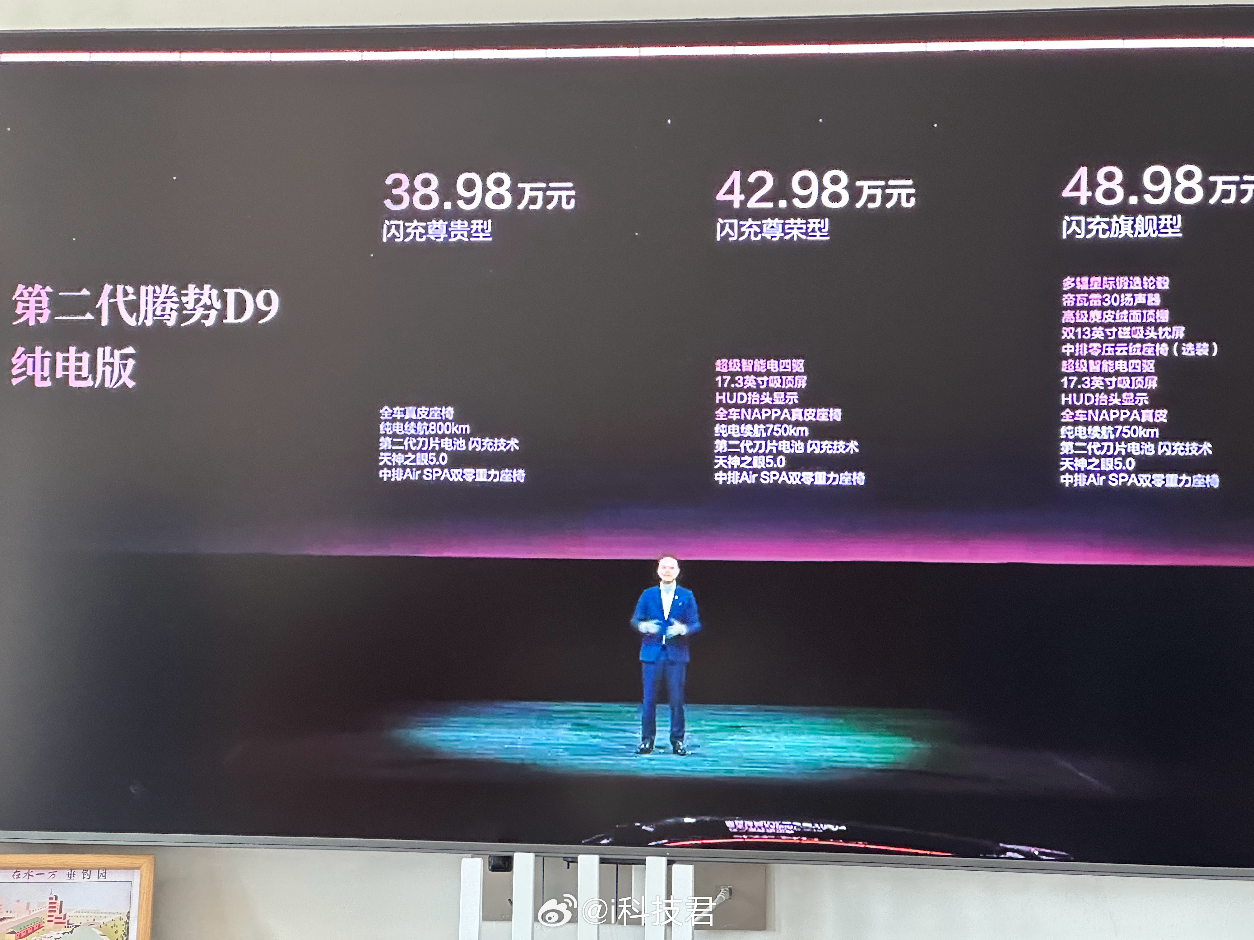 第二代腾势D9预售价格发布:纯电版本:38.98-48.98万插混版本:38.9