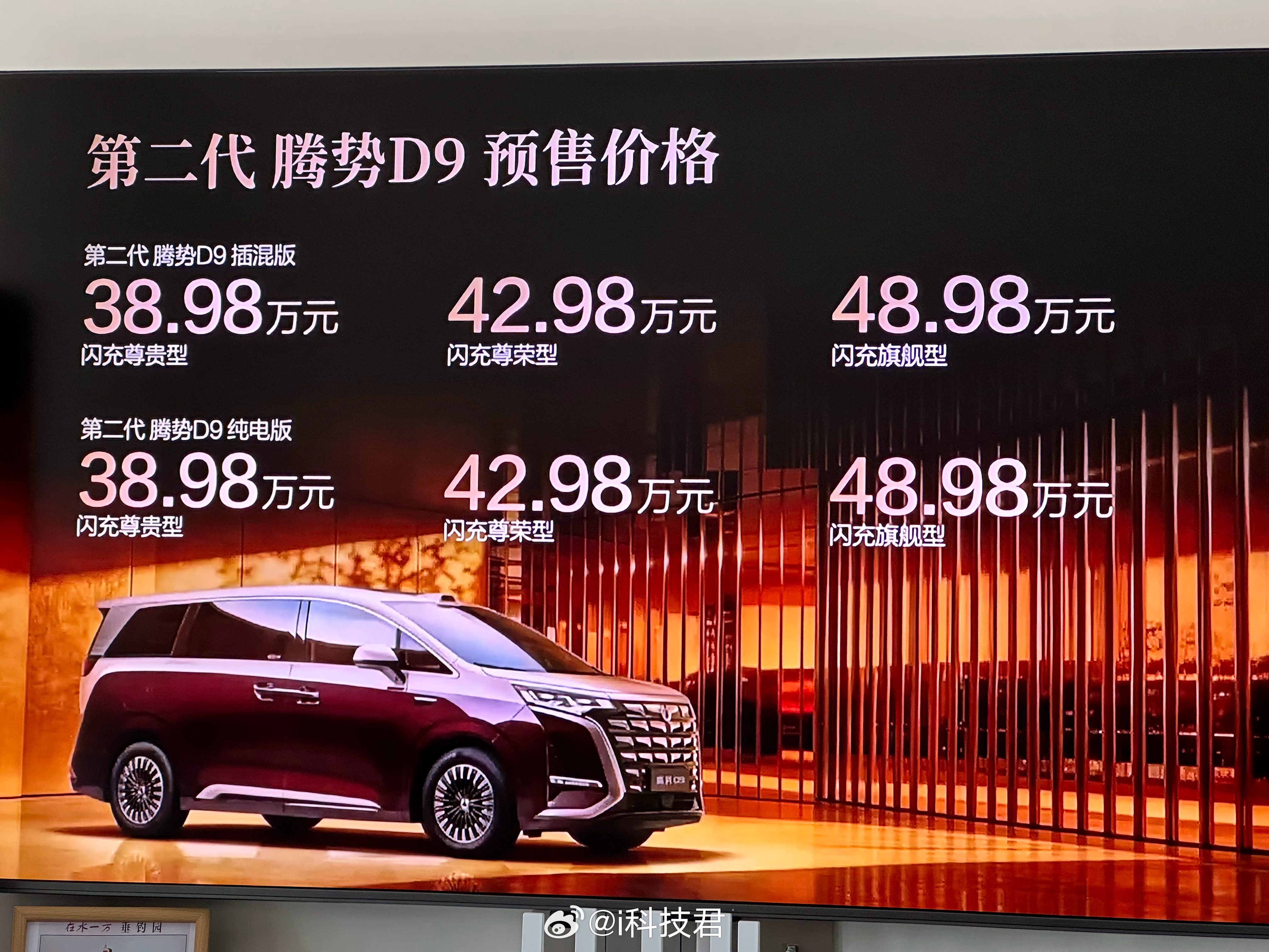 第二代腾势D9预售价格发布:纯电版本:38.98-48.98万插混版本:38.98-48.98万