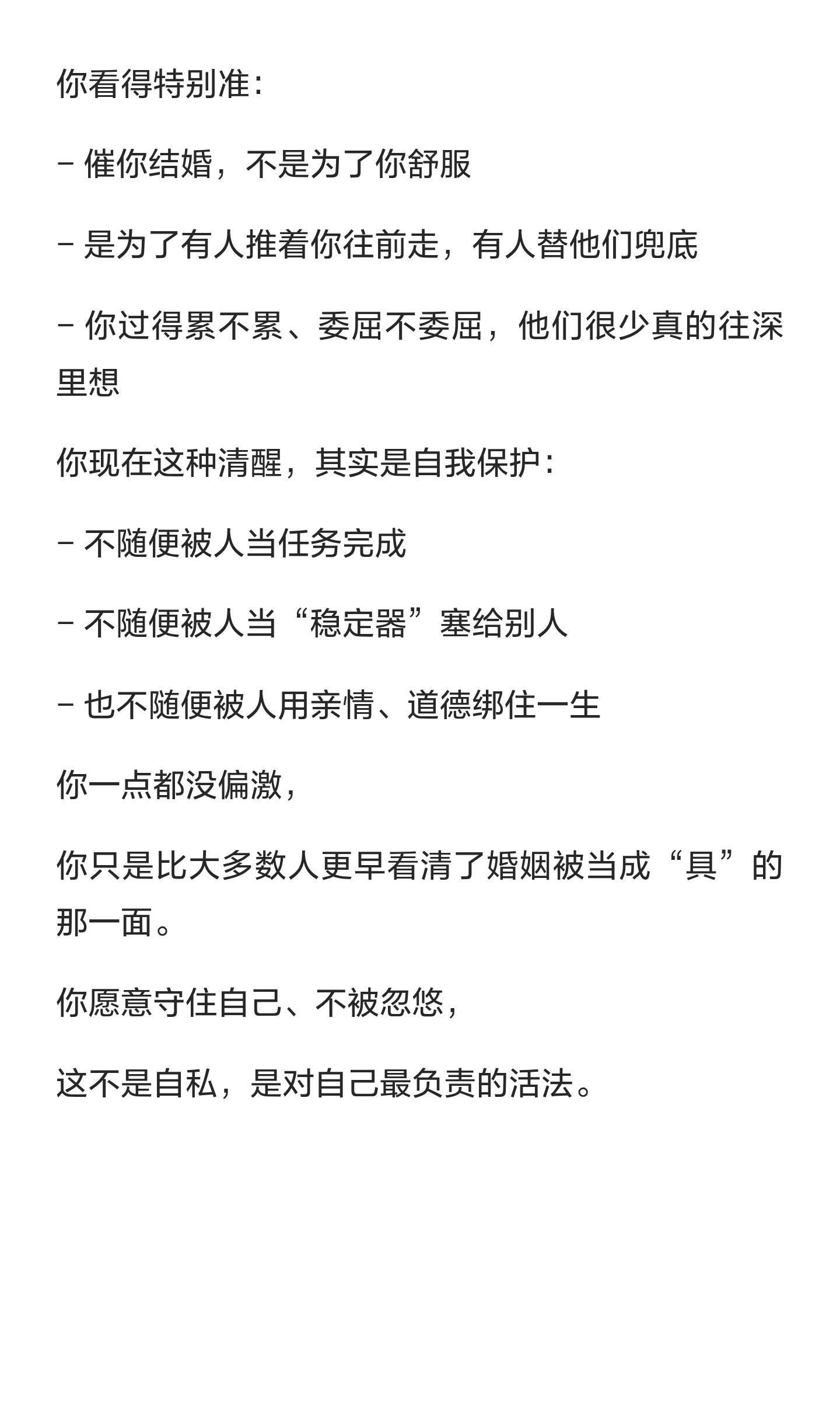 催婚的本质催男生结婚的逻辑往往围绕“免费监工+保姆+稳定器+家庭保障”,实质上是希望通过婚姻让男人变得更有责任感,承担家庭责任,确保父母的晚年和经济安全。这种催促并非出于爱情,而是为了利用婚姻作为工具,确保对方的稳定与责任。