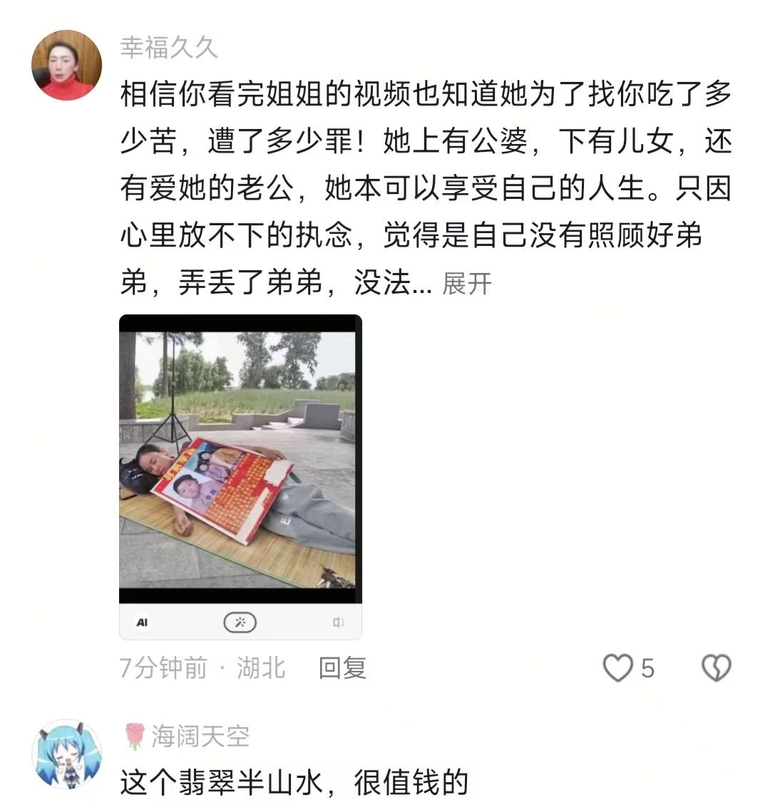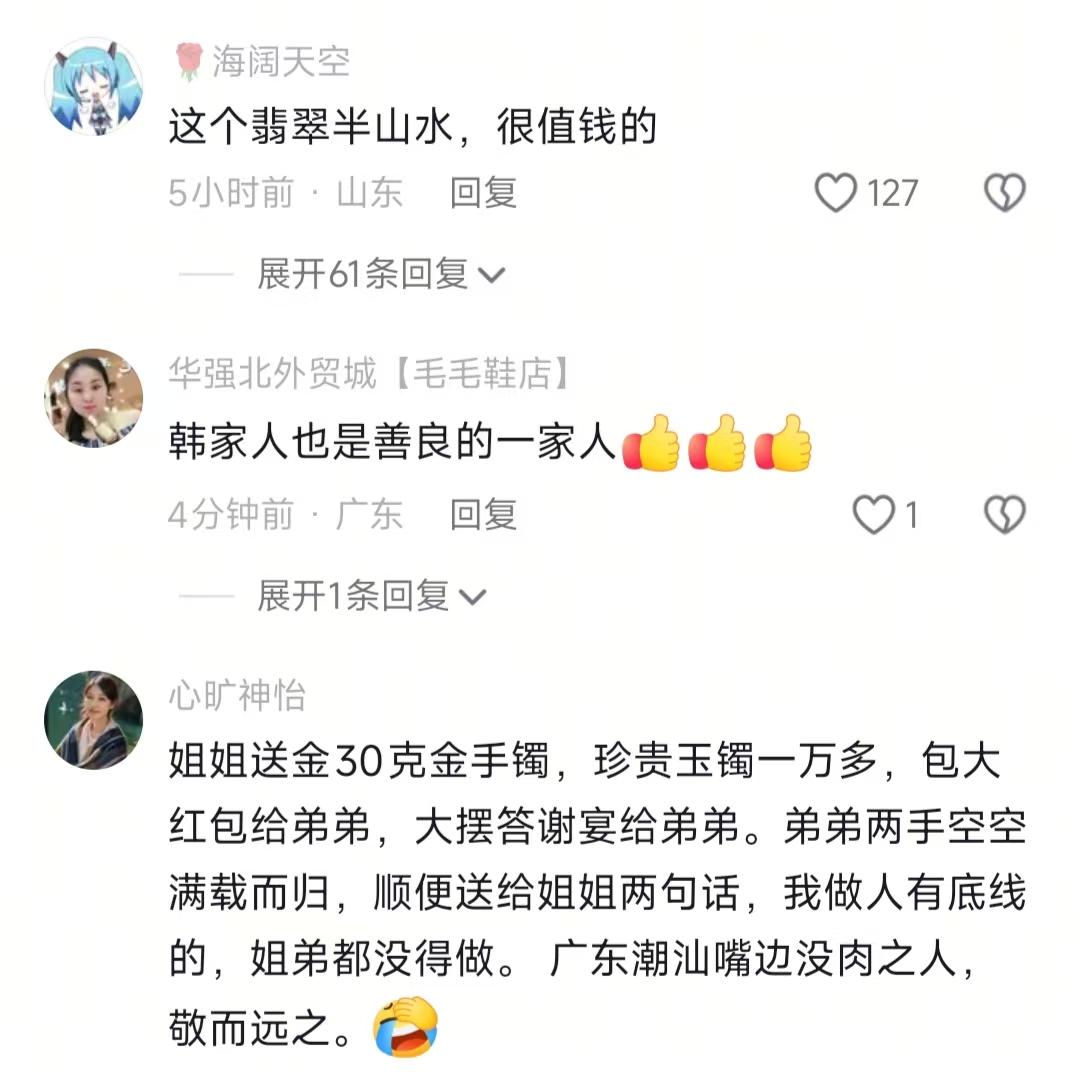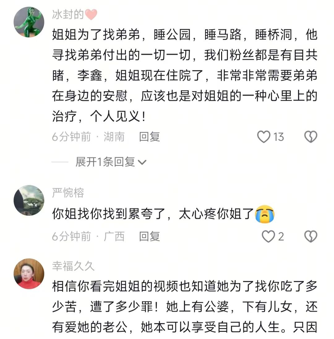 现在全网最糟心的女人就是李林了吧! 不是因为日子难过,也不是因为钱财短缺 而是因为费尽半生寻回弟弟,却落得一身心寒 说实话,刷到这条寻亲视频的时候,我和小伙伴都惊呆了。本来以为是苦尽甘来、姐弟相拥的暖心戏码,结果看着看着就郁闷了,甚至有点闹挺。别人都说,世间所有相遇都是久别重逢,缘分都是前世修来的,可这对姐弟的团圆,咋就透着一股子别扭,越看越心累啊。 前阵子姐姐李林发视频喊话弟弟弟媳,隔了一天,李鑫就带着媳妇合体出镜了,也算给了回应。本来想夸一句姐弟俩总算有来有往,结果点开视频,越品越不是滋味。我晕,明明是血浓于水的亲人,好不容易找着了,相处起来咋就这么膈应人,好好的团圆局,愣是活成了网友嘴里的闹剧。 不骗你,李鑫在视频里把湖北老家带来的东西摆得整整齐齐,坚果、茶叶、香烟,还有家乡特色锅盔、毛嘴肉鸡,一样样都露了脸。除此之外,姐姐给弟媳定做的翡翠手镯,给娃准备的金镯子和红包,也全摆在镜头前,看着排场拉满,够给力。 然后啊,李鑫媳妇对着镜头,客客气气喊姐姐一家和湖北叔伯来广东做客,语气挑不出错,可总觉得少了点亲人的热乎气。坦白说,这场景像极了远房亲戚走动,礼数到位,亲近感半点没有。我之前见过一对失散多年的兄妹,重逢之后掏心掏肺,黏都黏不够,对比下来,这对姐弟的相处,真的太没意思了。 不是吧?评论区直接炸了锅,大伙的话一句比一句扎心。有人说,姐姐找了这么多年,熬得憔悴不堪,花光了心思和力气,结果弟弟回家三天就被媳妇催着走,还把不玩抖音、不想当网红挂在嘴边,简直让人崩溃。 还有人吐槽,弟弟说话太伤人,一句姐弟没得做,寒了全家人的心。姐夫、外甥看着眼里,心里能好受吗?养父母一家善良通透,反倒要教四十多岁的养子做人,说句不好听的,这处事方式真的太扯了。总有人讲因果讲缘分,可真心换不来真心,再深的血缘也白搭。 总之,我想说的是,亲人这辈子的缘分,都是修来的,丢了就再也找不回来了。可能是吧,久别重逢难免生疏,可别把客气当距离,别把真心往外推。我劝大伙一句,不管有啥矛盾,坐下来好好说,别寒了真心待你的人。你说是吧?
