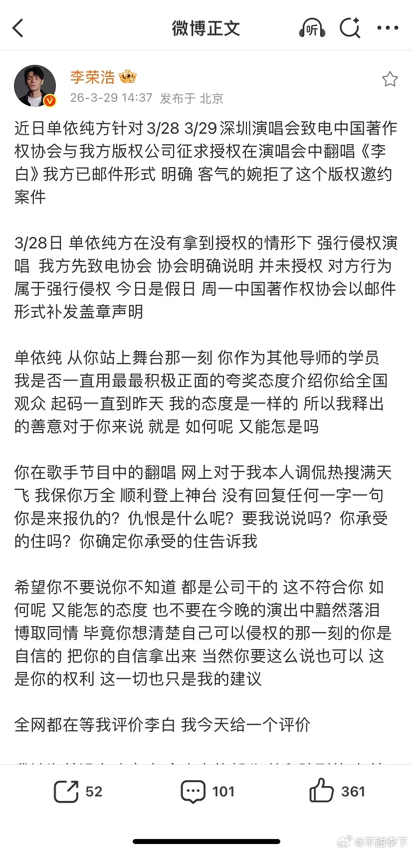 李荣浩发文控诉单依纯强行侵权演唱他的李白李荣浩 单依纯强行侵权