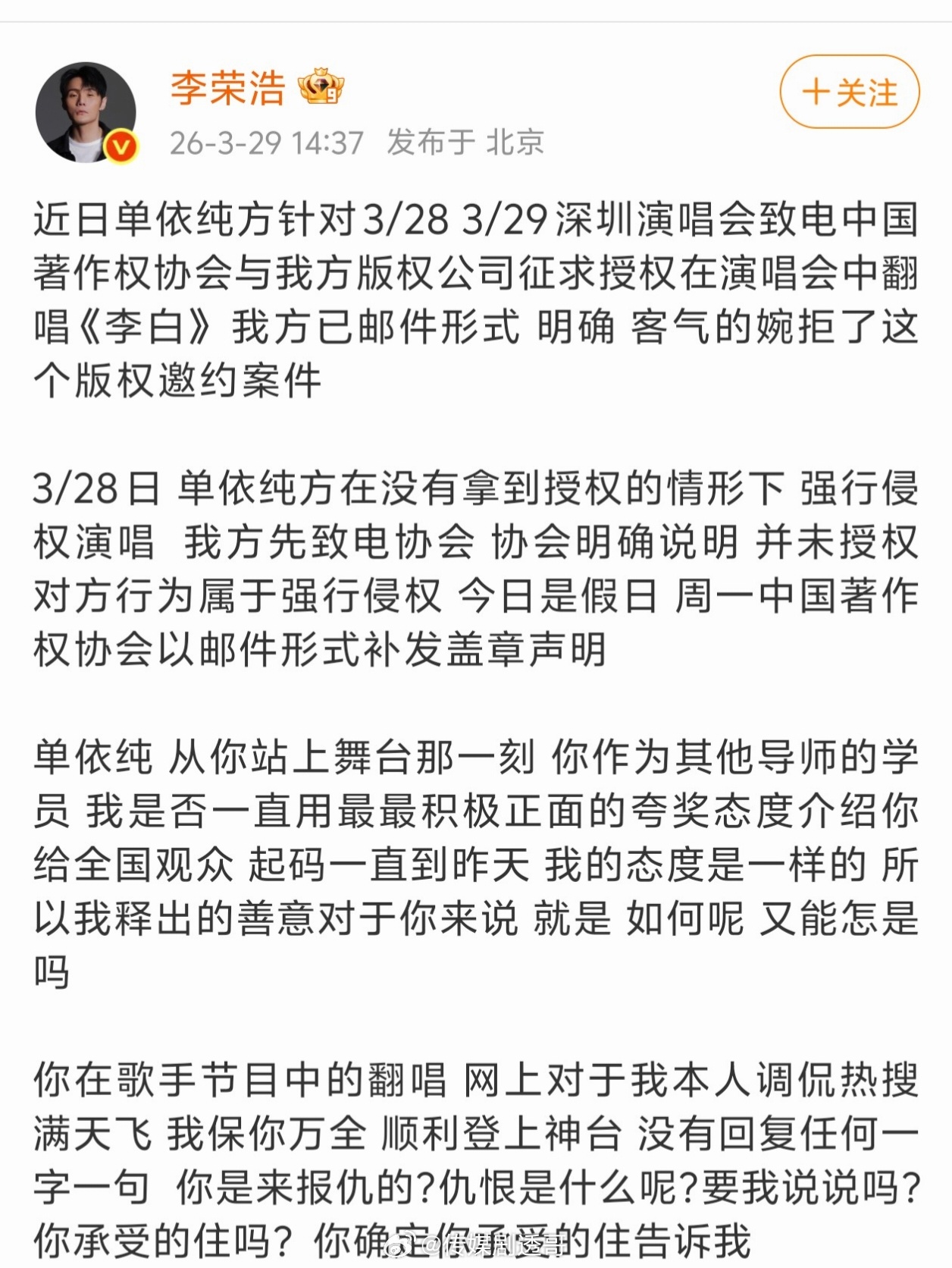 李荣浩发文维权,单依纯演唱改编的《李白》侵权