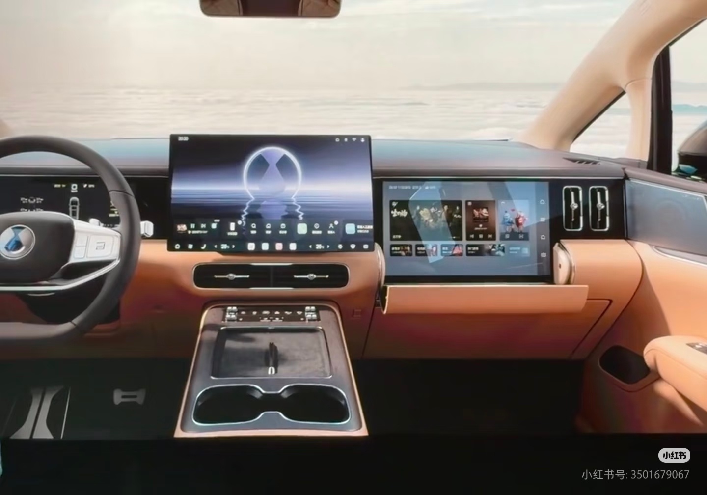 没想到腾势 D9 不仅同时提供了后排吸顶屏和靠背屏,副驾屏也是大有乾坤,可开合适配不同的使用场景,这个创意不错。