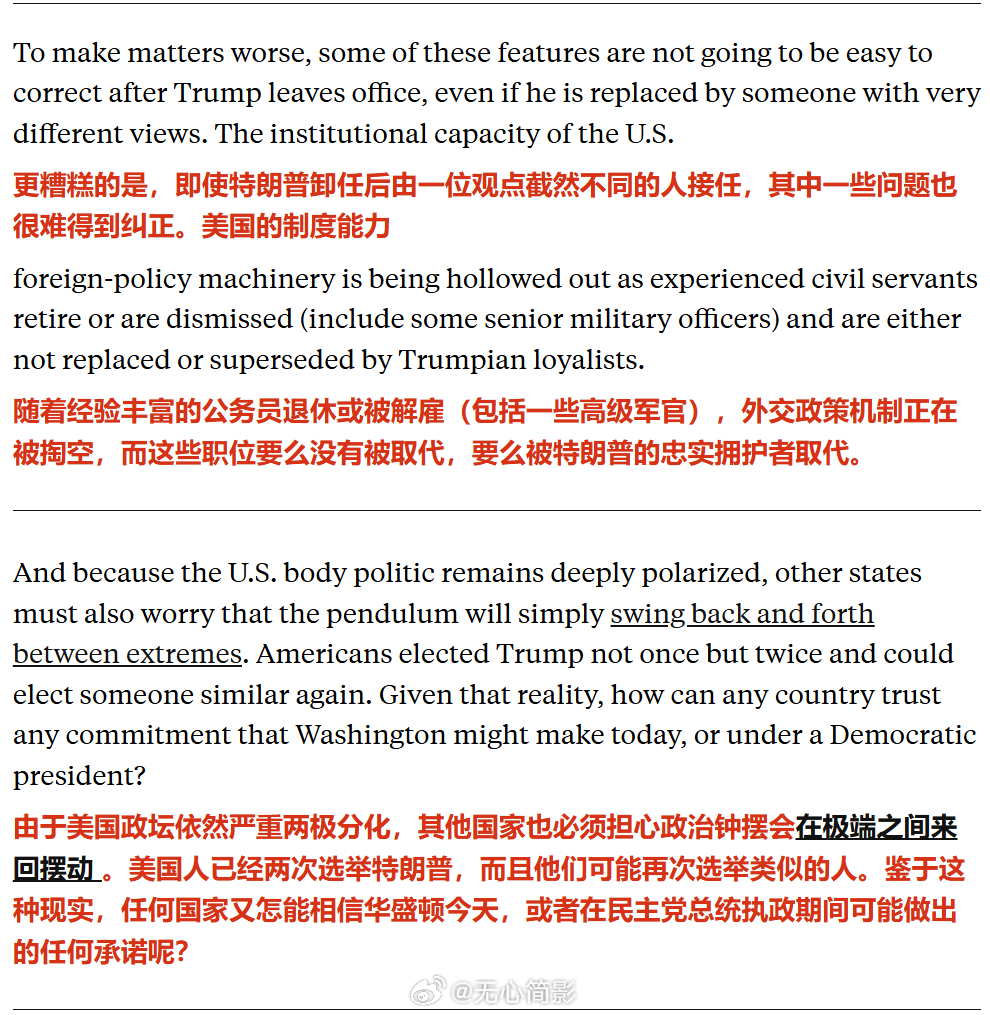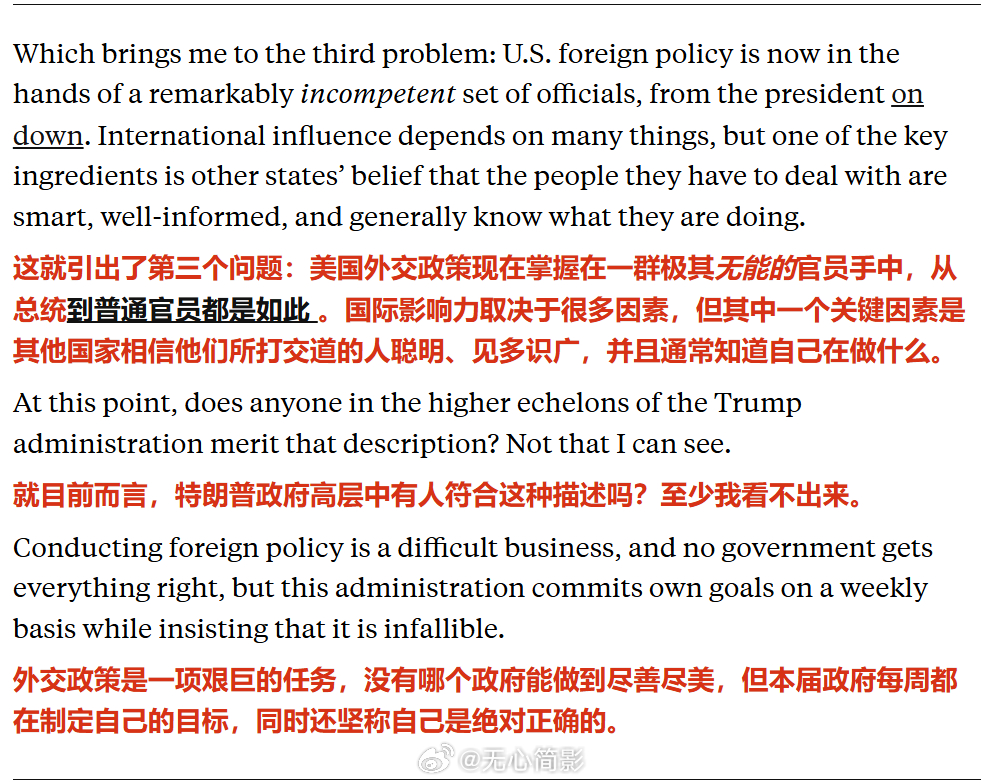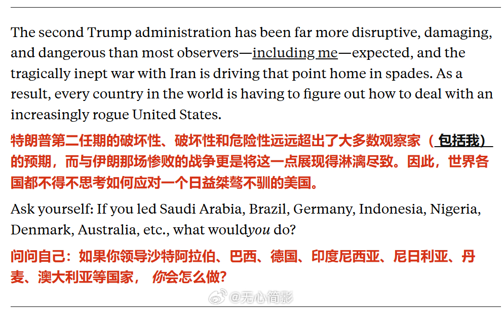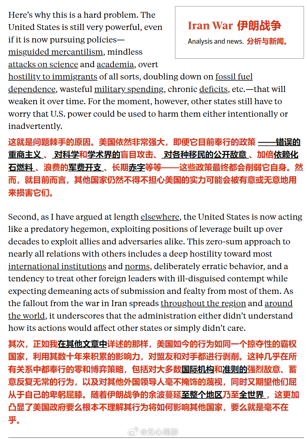 文章大概截图了一半,大家自己看,出发点就是特朗普发动伊朗战争对全球各个国家的破坏性,但问题是,美国主导下的世界秩序,这种破坏性并不是今天才发生的,而是在过去的长时间以来,局部地,系统性地,有预谋地长期发生着,而特朗普这次是让这种破坏性范围更大,更加失控了而已。