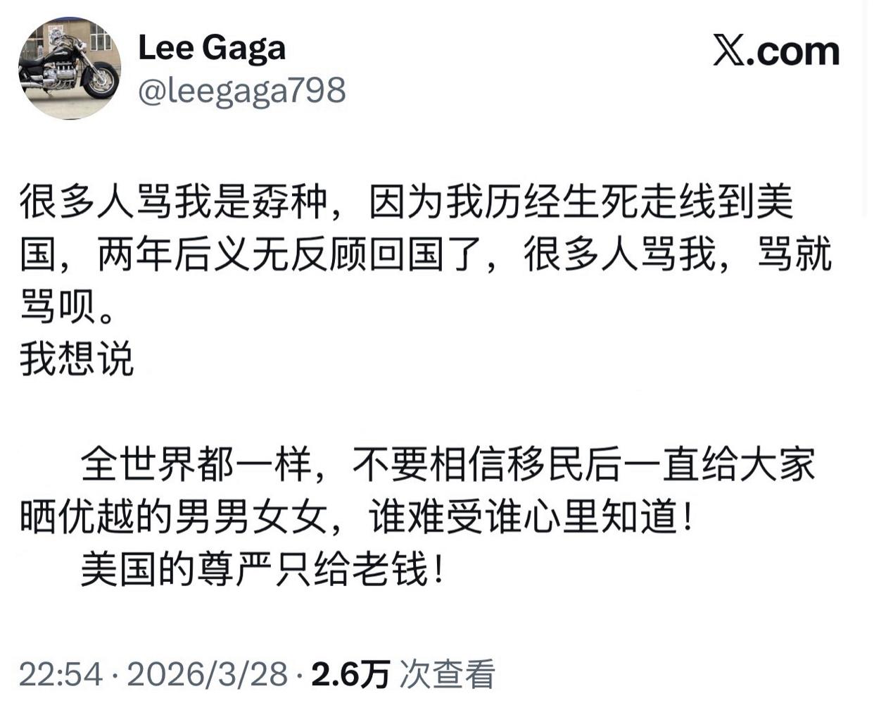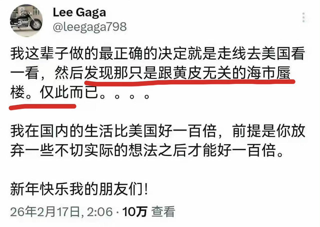 有一位润到美国的华人男子,两年后,选择离开美国回到国内。 他曾发文表示:美国的沙滩是民主的沙滩玩,可以让孩子在那里无忧无虑的玩耍,虽然回到了国内,但是他觉得他这辈子做的最正确的决定就是到美国去看一看,然后认清了美国,而回到国内,随便别人怎么取笑他,至少他已经睁眼看过“世界”。 他感觉润到美国两年后,又重新回到国内的家里,真的非常好、非常魔幻,他以后再也不会因为环境问题而内耗了,因为他发现,他在国内的生活比美国好一百倍,前提是要放弃一些不切实际的想法。 因为他润到美国两年后,又“义无反顾”的选择回到国内,很多人就骂他是怂人,他想说,要骂就骂吧,但是请不要相信那些移民国外后,一直给大家晒优越感的人,因为谁难受谁心里最清楚,而美国的尊严只留给有钱人。