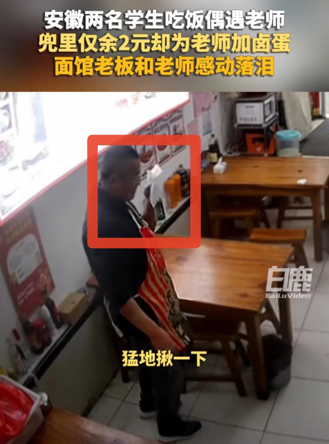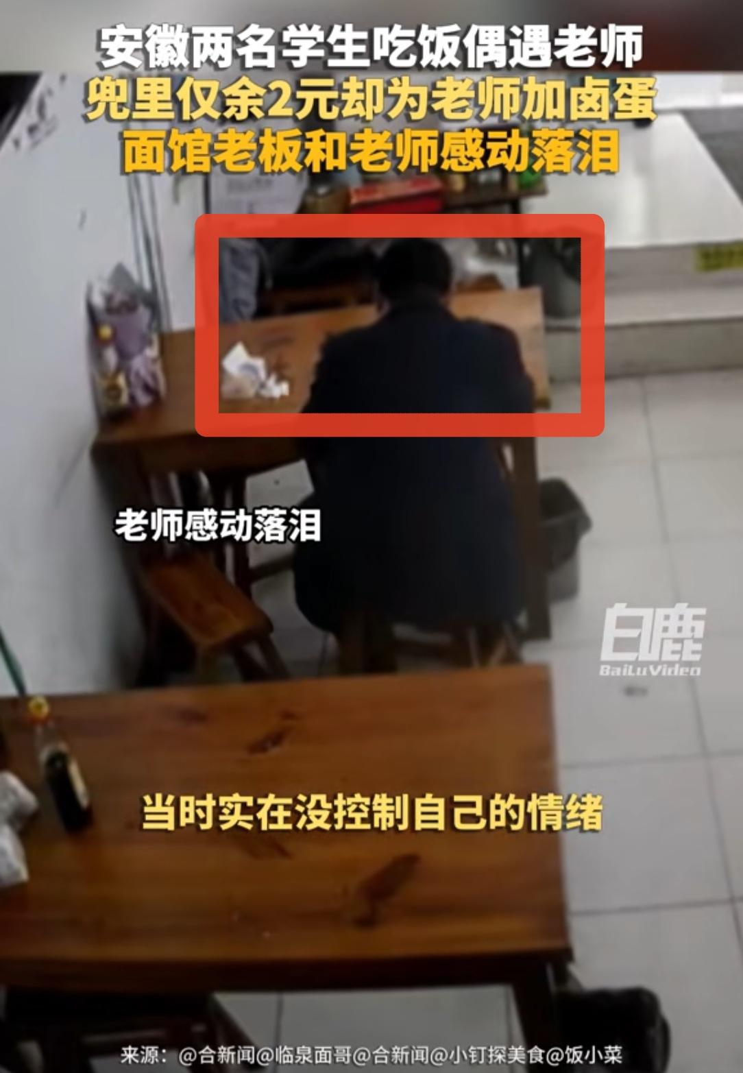 给老师感动哭了! 安徽,一群初三的体育生放学去面馆吃面,不想居然遇见老师,本想想看看老师吃的什么好吃的,凑近一看,老师碗里一点菜都没有 学生心疼老师,掏出自己仅剩的2元钱给老师加了个鸡蛋,还让老板不要告诉老师。事后,不仅给老师感动的流泪,老板也忍不住在一旁 像这样有感恩之心的学生,是每一个老师想遇到的,不管成绩好坏,人品好,出了学校,才会受到更多的人喜欢