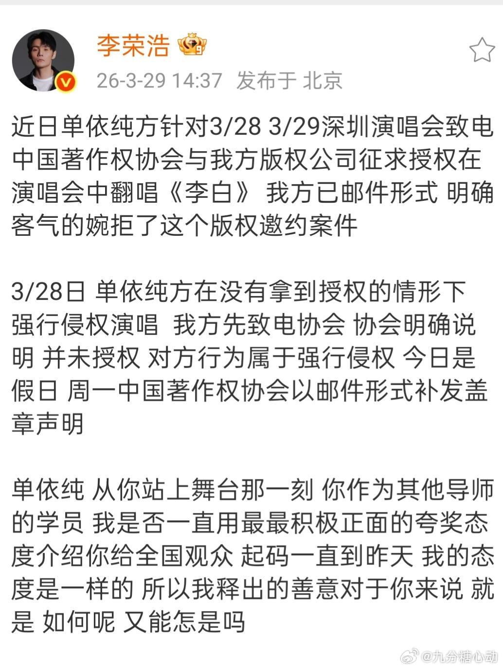 李荣浩开撕单依纯! 李荣浩 单依纯强行侵权