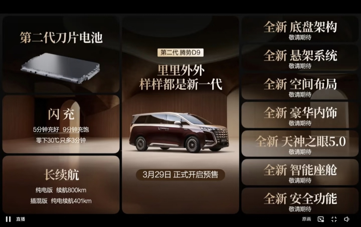 今天上午11点全新腾势D9预售发布会的价格出来了,由王传福的得力助手腾势汽车总经理李慧主讲。公布38.98-48.98万预售价时,现场先惊后掌声热烈,认可比亚迪的技术升级价值。 全系标配二代刀片电池、9分钟闪充、天神之眼5.0+激光雷达、云辇-C与后轮转向,成本大幅提升,比老款同配置贵约8万。大家说这么多顶尖的配置值不值 比魏牌高山贵10.4万、岚图梦想家贵7.99万、传祺E9贵7万,不过腾势D9的续航、补能、智驾、底盘全面换代,物有所值。虽涨价,但腾势品牌与渠道稳固,涨价的腾势D9会让大家接受吗?