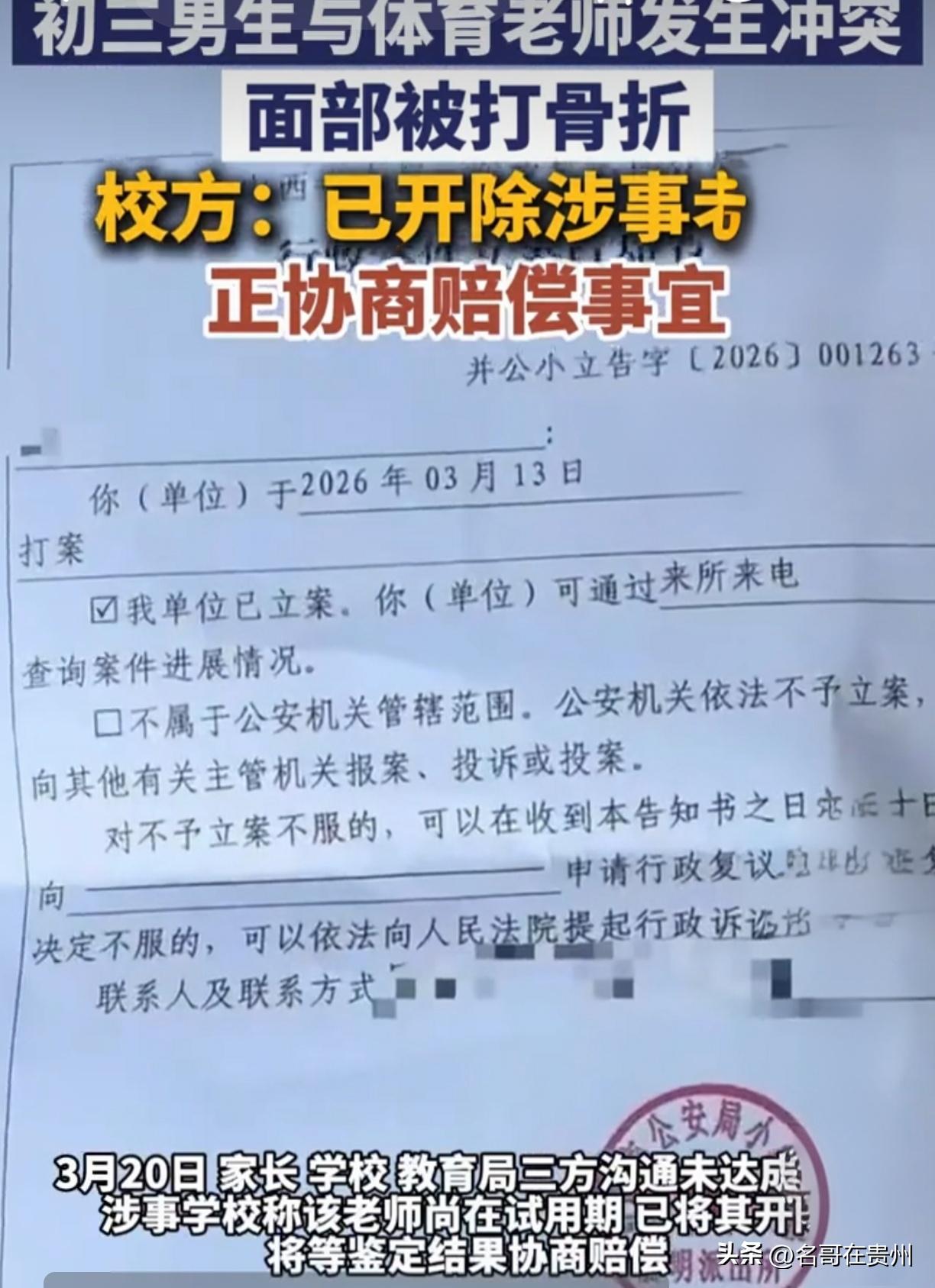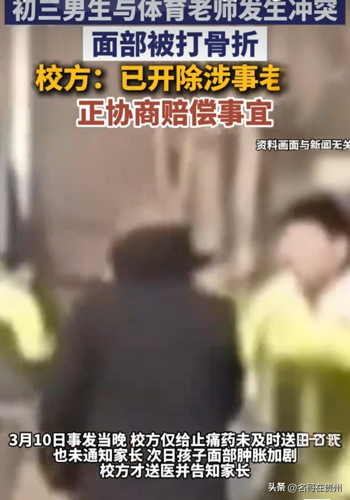 初三男生体育课被打骨折!校方回应:老师试用期,已开除 初三男生面部骨折,学校竟只给一颗止痛药糊弄?这到底是教书育人的地方,还是“暴力训练营”? 山西太原的郭女士最近快急疯了,她读初三的侄子小郭,正是中考冲刺的关键期,居然在学校被体育老师给“收拾”了,而且伤得不轻——左侧上颌骨骨折! 很多人可能会想,初三的男孩子正是人高马大的时候,得犯了多大的错,老师才能气成这样? 咱先别急着下结论,来看看细节。 事情发生在3月10日的体育课上。据家属透露,起因就是师生之间发生了点口角。咱们都知道,初三的孩子正处于青春期,有点叛逆,顶两句嘴是常事。但接下来的操作就离谱了:这名体育老师杨某(据说还在试用期)直接情绪失控,跟学生动起了手。 结果呢?一个成年人把一个孩子打到面部骨折。 更让人寒心的是接下来的操作。据孩子姑姑说,当天晚上孩子脸就疼得不行,按说这种面部创伤,肉眼都能看出来肿了,得赶紧送医排查吧?学校没有,只给了一颗止痛药打发孩子睡觉。 忍了一夜,第二天脸肿得更像馒头了,校方这才觉得兜不住了,把孩子送去医院。检查报告一出,所有人都倒吸一口凉气:左侧上颌骨骨折、错合畸形。 这时候,学校才想起来通知家长。 家长能不炸吗?孩子寄宿在学校,每年交着近4万的高额学费,结果被老师打成这样,学校第一反应不是救命,竟然是“掩盖”和“拖延”? 这要是没骨折,是不是一颗止痛药就算完事了? 面对舆论压力,校方负责人的回应也很“微妙”。先是表态:“老师没控制住情绪,很不应该,我们已经严肃处理(开除了)。” 但解释为什么没第一时间通知家长时,竟然来了句:“校园里孩子多,男孩子之间难免磕碰……” 听听,这是人话吗? 她把一个成年教师对未成年学生的暴力殴打,轻描淡写地说成了“男孩子之间的磕碰”? 现在这事已经闹大了,家长报了警,教育局也介入了。最新的消息是,警方已经立案,正在做伤情鉴定。 而且大家要知道,就在今年,新修订的治安管理处罚法已经施行,明确将学生欺凌和暴力纳入严管范畴,年龄再也不是免责的挡箭牌。 但这件事最让我破防的不是骨折,而是另一个细节:孩子3月16日已经返校上课了。 你能想象吗?一个面部骨折、可能需要手术、甚至面临增生风险的孩子,为了不落下中考,竟然不得不顶着伤,回到那个被老师殴打、校方冷漠的校园里继续读书。 这就是现实最扎心的地方。我们总在讨论“师生冲突如何界定责任”,但对于普通家庭来说,哪怕事后老师被开除了,哪怕学校赔钱了,孩子脸上留的疤,心里留的阴影,谁来赔? 那个正准备中考的孩子,那个对未来充满憧憬的少年,他的自信和笑容,就在那堂体育课上,被一拳打碎了。 对此事你怎么看?你觉得学校只开除一个试用期老师就够了吗?如果是你,你会选择和解还是坚决起诉?欢迎在评论区留言。 作者申明: 本文内容来源于极目新闻、凤凰网等媒体对“太原初三男生被体育老师打骨折”事件的综合报道,以及相关法院及法律条文解读,具体案情以官方最终通报为准。