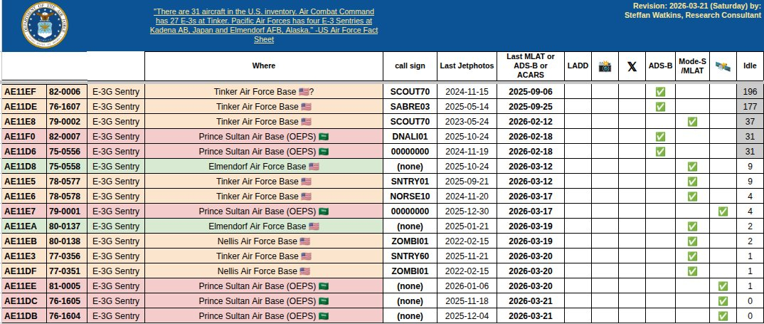 🔻伊朗法尔斯通讯社分享图片称:隶属于美国空军第 552 空中控制联队、驻扎在俄克拉荷马州廷克空军基地的一架 E-3G“哨兵”空中预警与控制飞机(编号 81-0005)在3 月 27 日伊朗对沙特阿拉伯苏丹王子空军基地的弹道导弹和无人机袭击中完全损毁。🔻从图片看,此次打击似乎命中了 E-3 最关键的部分,即飞机后部装有旋转雷达罩的区域,该罩内包含多个敏感仪器,包括 E-3 的 AN/APY-2 监视雷达系统的天线。🔻追踪数据证实,81-0005 号机确实是部署至沙特阿拉伯苏丹王子空军基地、参与“史诗之怒”行动的 E-3G 哨兵预警机之一。如果照片真实、战果属实的话,美国空军可运行的 E-3 机队规模已从 16 架缩减至 15 架。胡塞伊朗黎巴嫩同步袭击以色列美国全国爆发反对特朗普政府集会海外新鲜事中东现场直击