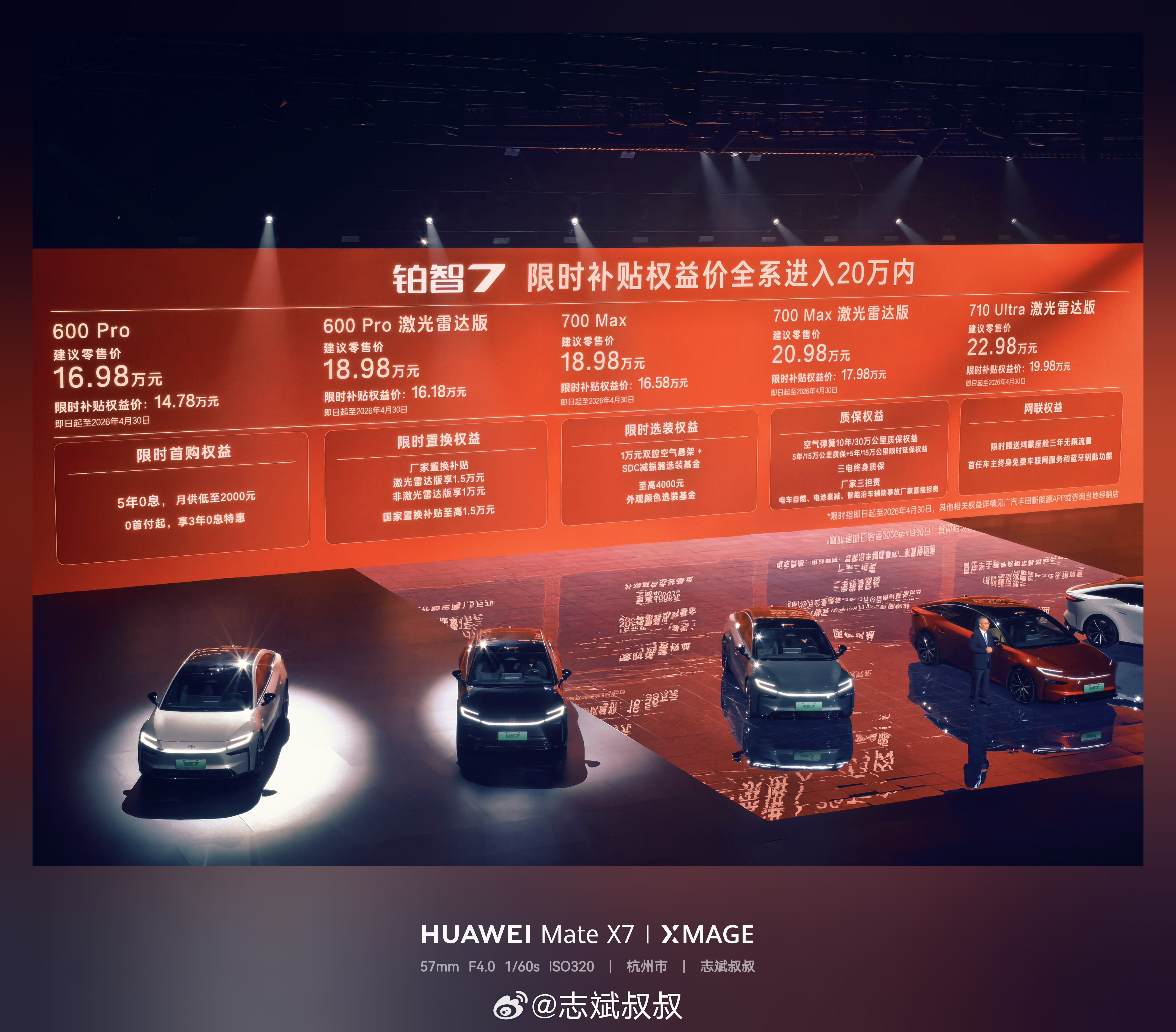 我订的700max激光雷达版,建议零售价20.98万元,补贴完17.98万元,顶配的Ultra也是19.98万元,全系压在了20万元以内。