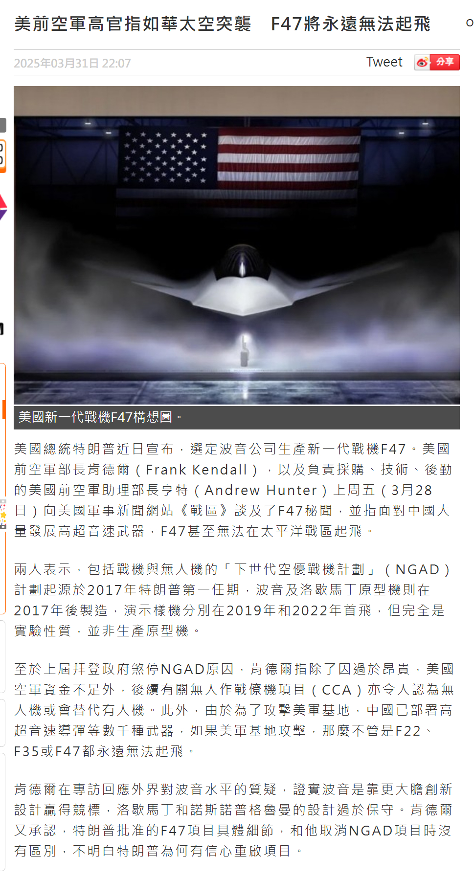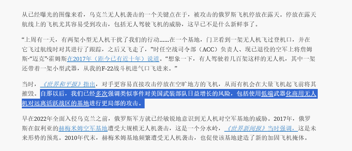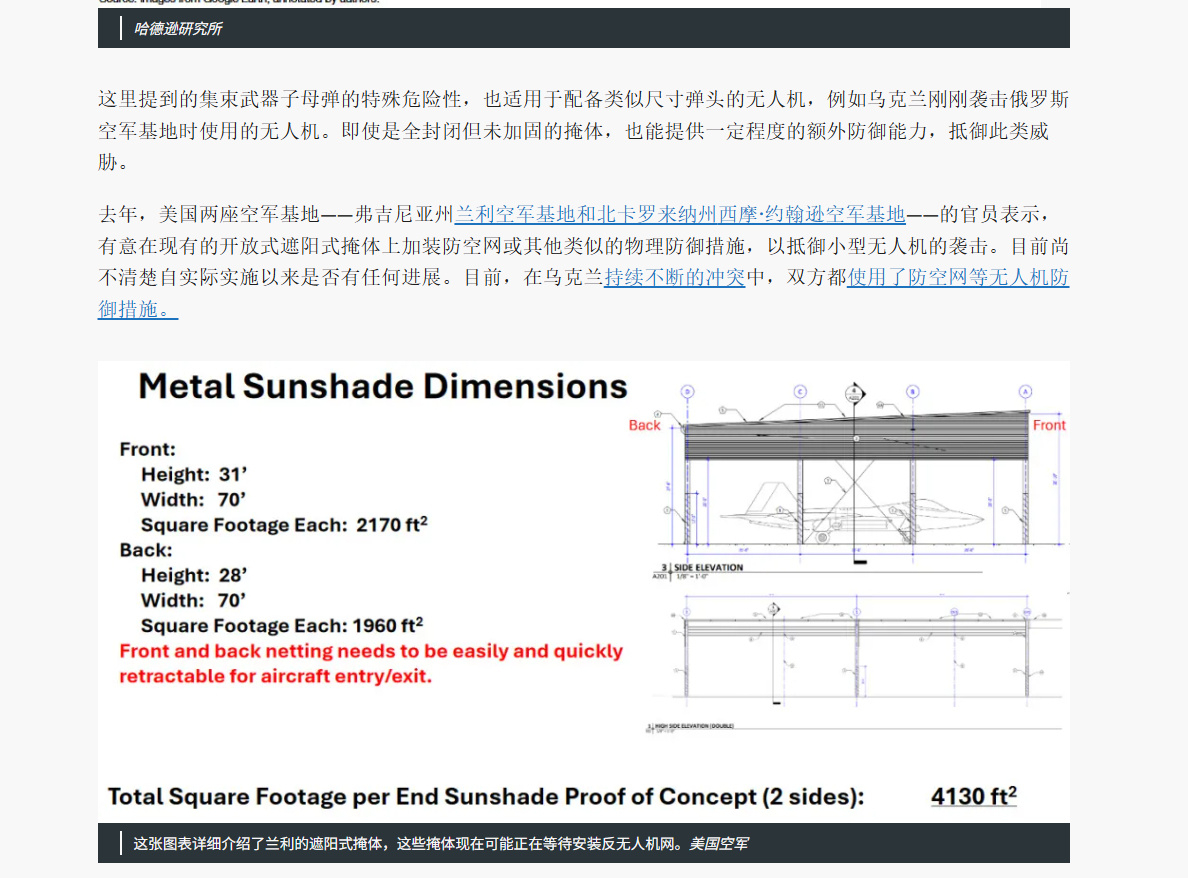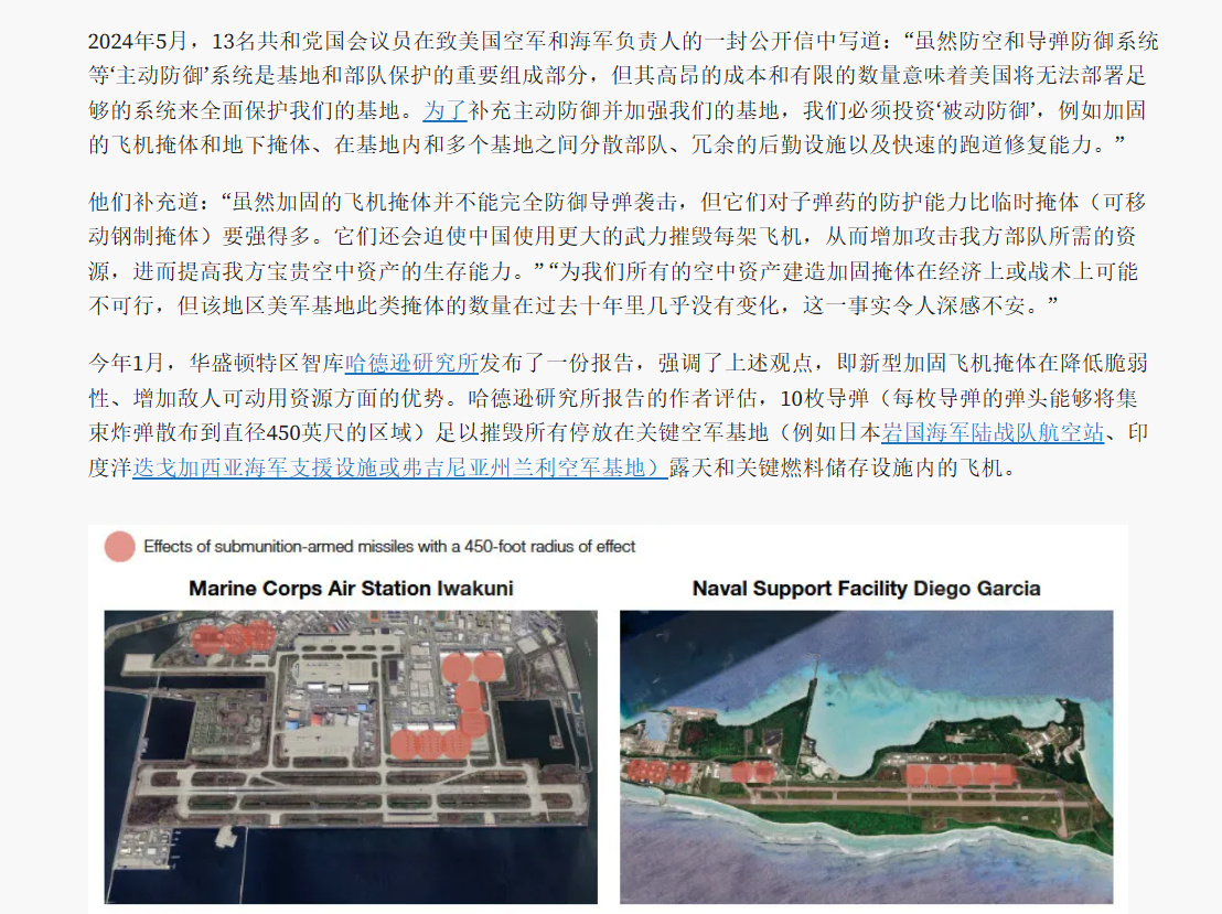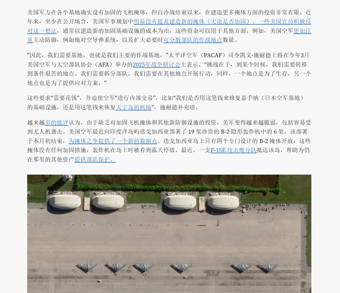 🔻美军在中东这种无防护机库的机场运营预警机、加油机这样的高价值战略机队,连伊朗并不是特别先进的导弹和无人机都能造成如此大的损失。🔻在西太的美军怎么办?嘉手纳、安德森的防护机库很多吗?🔻去年乌克兰针对俄罗斯轰炸机发起蛛网行动的时候,TWZ 就痛心疾首:“日本岩国海军陆战队航空站、印度洋迭戈加西亚海军支援设施、关岛安德森空军基地或者弗吉尼亚州兰利空军基地都没有足够多的加固机库,美国武装部队在部署远程部队、本土及周边基地和其他资产的反无人机防御系统方面也仍然落后。在2024年10月举行的美国军方反无人机试验‘猎鹰峰2025’期间,华尔街日报和其他媒体被告知,至少在当时,激光、微波、地对空导弹和枪械都不可能成为在美国境内摧毁无人机的选项。”🔻美国前空军部长肯德尔,以及负责采购、技术、后勤的美国前空军助理部长亨特对 TWZ 说的话更直白:美军研发个屁的F-47,没卵用,在西太,面对东大的大量高超音速武器,不管是F-22、F-35或F-47都永远没有起飞的机会。🔻图9、图10 关岛安德森基地。图11 卡塔尔乌代德基地。图12 迪戈加西亚基地。🔻B-52 烧起来也很快的。胡塞伊朗黎巴嫩同步袭击以色列美国全国爆发反对特朗普政府集会海外新鲜事中东现场直击