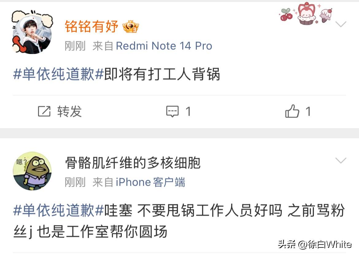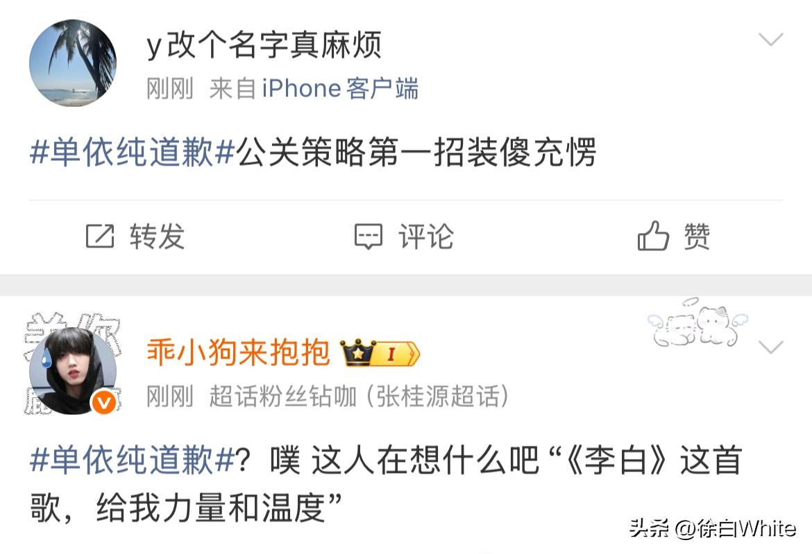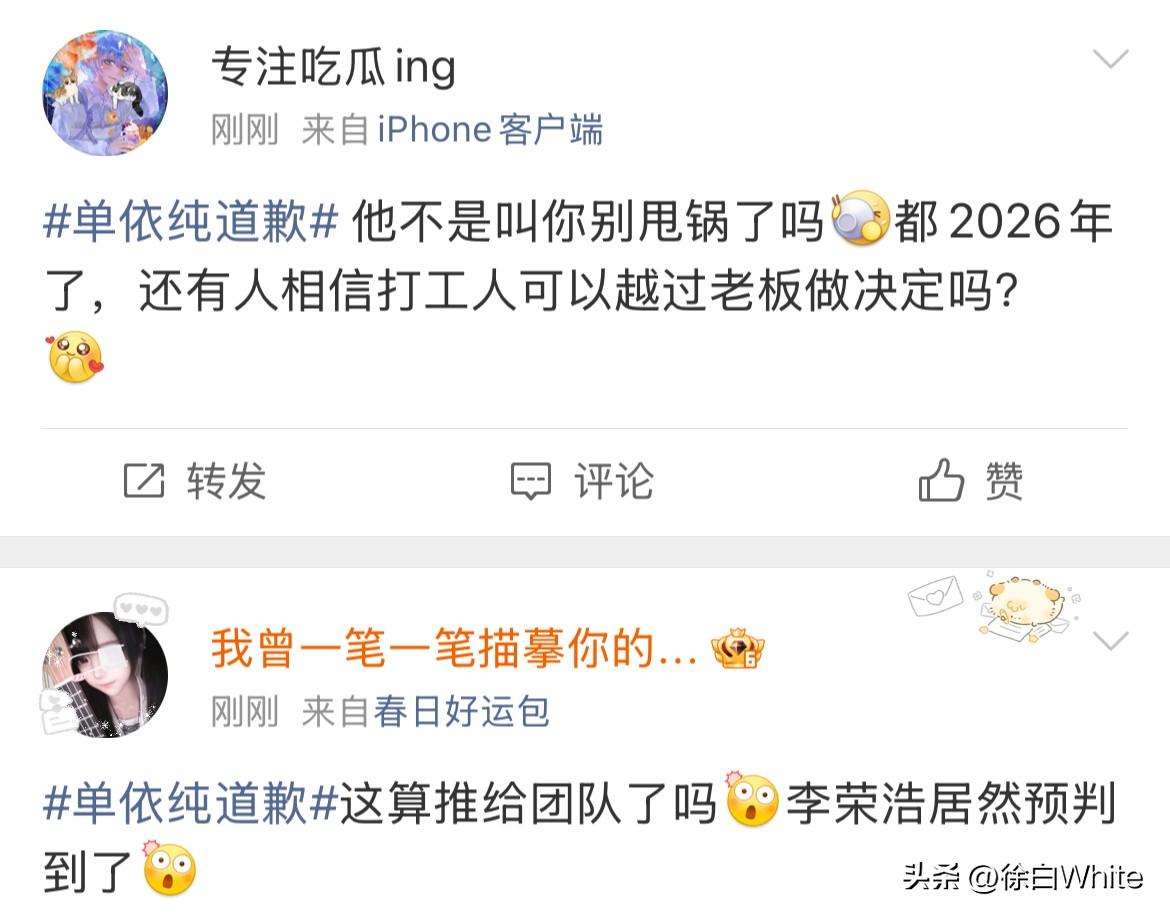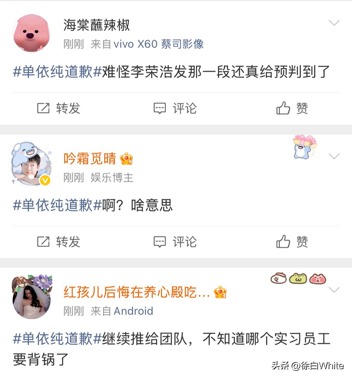 3月29日,单依纯发文公开向李荣浩道歉! 李荣浩成功预判了单依纯的道歉,把责任推给团队!这个道歉不是李荣浩想要的! 李荣浩在控诉长文中有预判说,希望你不要说你不知道,都是公司干的,这不符合你! 可偏偏在看到李荣浩这话后,单依纯还是选择把责任推给团队,说自己会跟团队尽快搞清楚情况的,李荣浩的意思是单依纯肯定知道,单依纯的意思是我不知道,错在团队! 怎么说呢,看私下怎么道歉吧,感觉李荣浩不太会接受单依纯这样的道歉! 真不如一句,我错了,李荣浩老师,对不起!