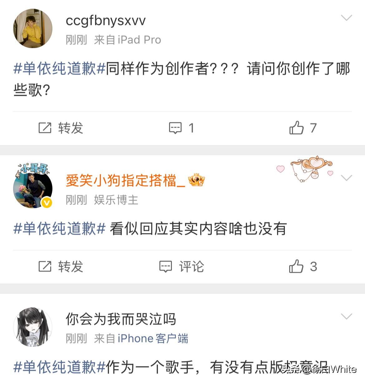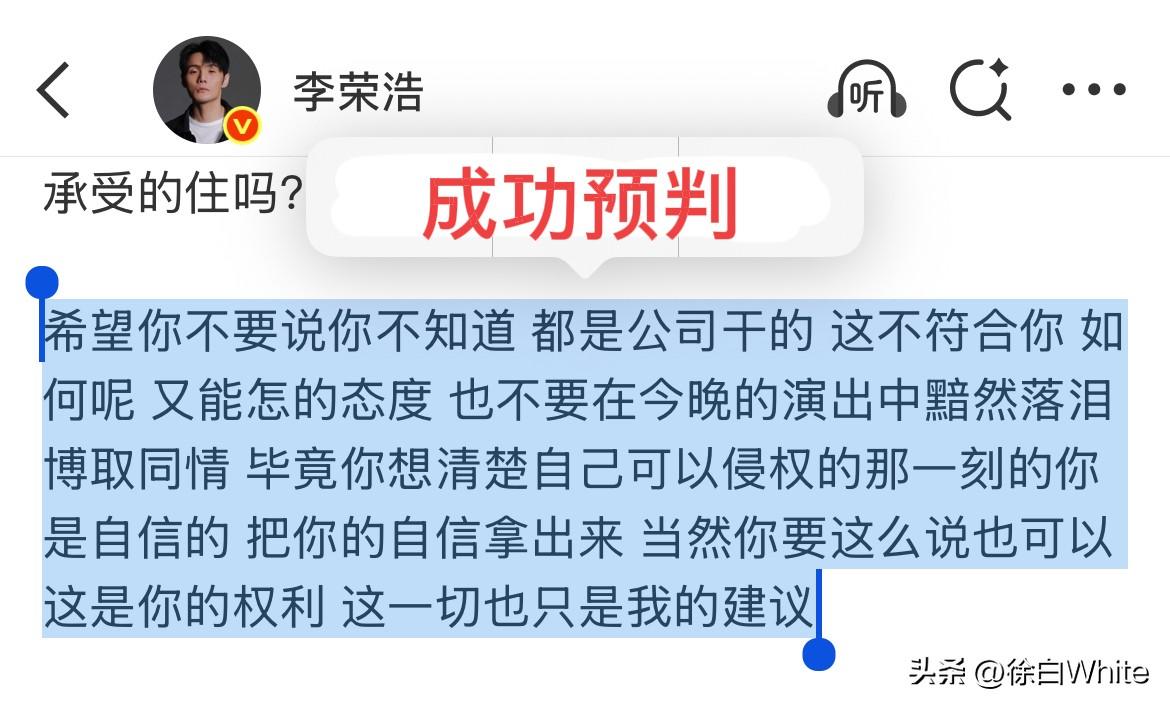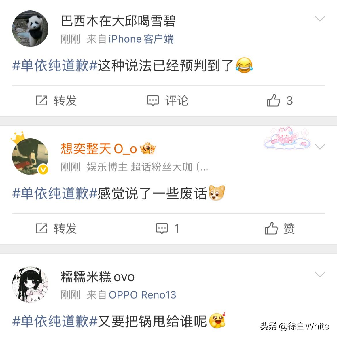 3月29日,单依纯发文公开向李荣浩道歉! 李荣浩成功预判了单依纯的道歉,把责任推给团队!这个道歉不是李荣浩想要的! 李荣浩在控诉长文中有预判说,希望你不要说你不知道,都是公司干的,这不符合你! 可偏偏在看到李荣浩这话后,单依纯还是选择把责任推给团队,说自己会跟团队尽快搞清楚情况的,李荣浩的意思是单依纯肯定知道,单依纯的意思是我不知道,错在团队! 怎么说呢,看私下怎么道歉吧,感觉李荣浩不太会接受单依纯这样的道歉! 真不如一句,我错了,李荣浩老师,对不起!