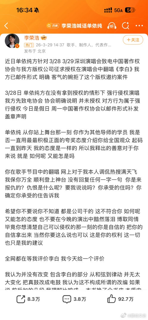 李荣浩 单依纯强行侵权“邮件形式 明确 客气的婉拒了这个版权邀约案件”过了这么久才起诉也算客气了