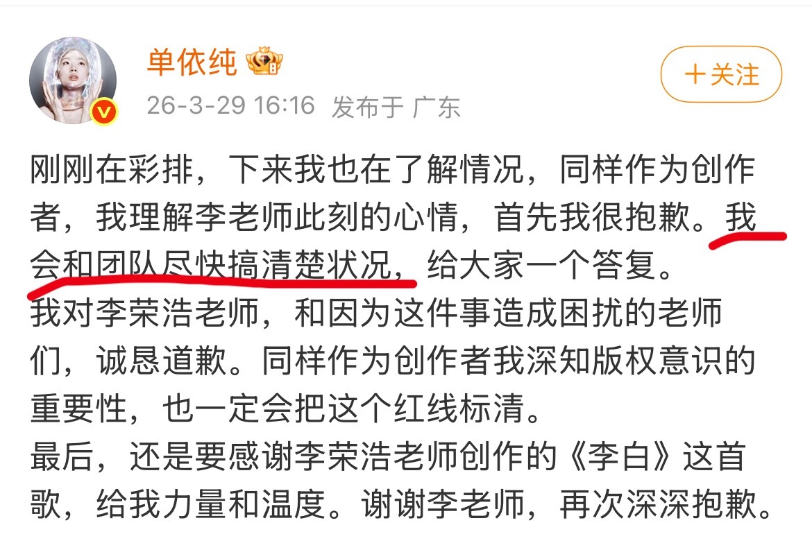 单依纯道歉了,果然推给了团队~然而李荣浩老师对这一切已经预判,希望她“不要说不知