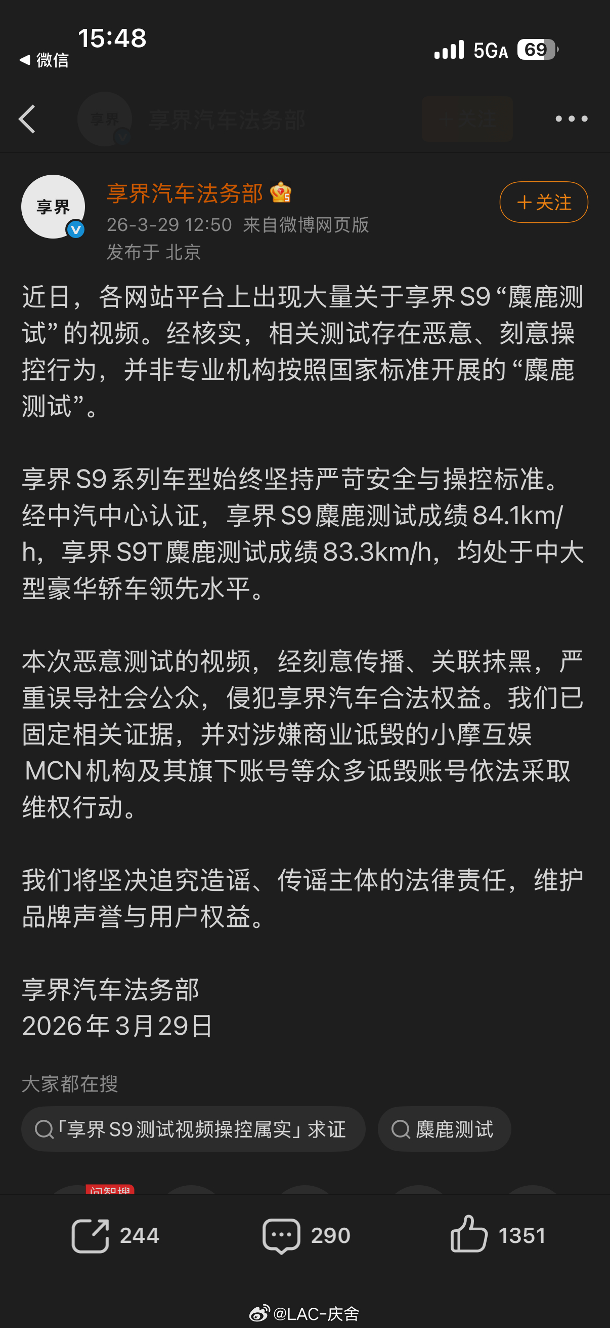享界汽车回应网传S9麋鹿测试视频作为使用时间最长的享界S9车主,我来说两句(全国首批提车,截止到今天开了31489公里)都说媒体买车是为了合作,买完就卖,但这台车是我实实在在用了600天,也是我们家这两年开的最多的车没有之一。为什么留得久?因为它足够的舒服、智能,而且作为一个资深的汽车博主,它在运动状态下水准也是同级别非常优秀的。树大招风,人怕出名,看看图3的截图,都出自于同一家MCN公司,大家就不难理解了。MCN机构涉嫌诋毁宝马享界