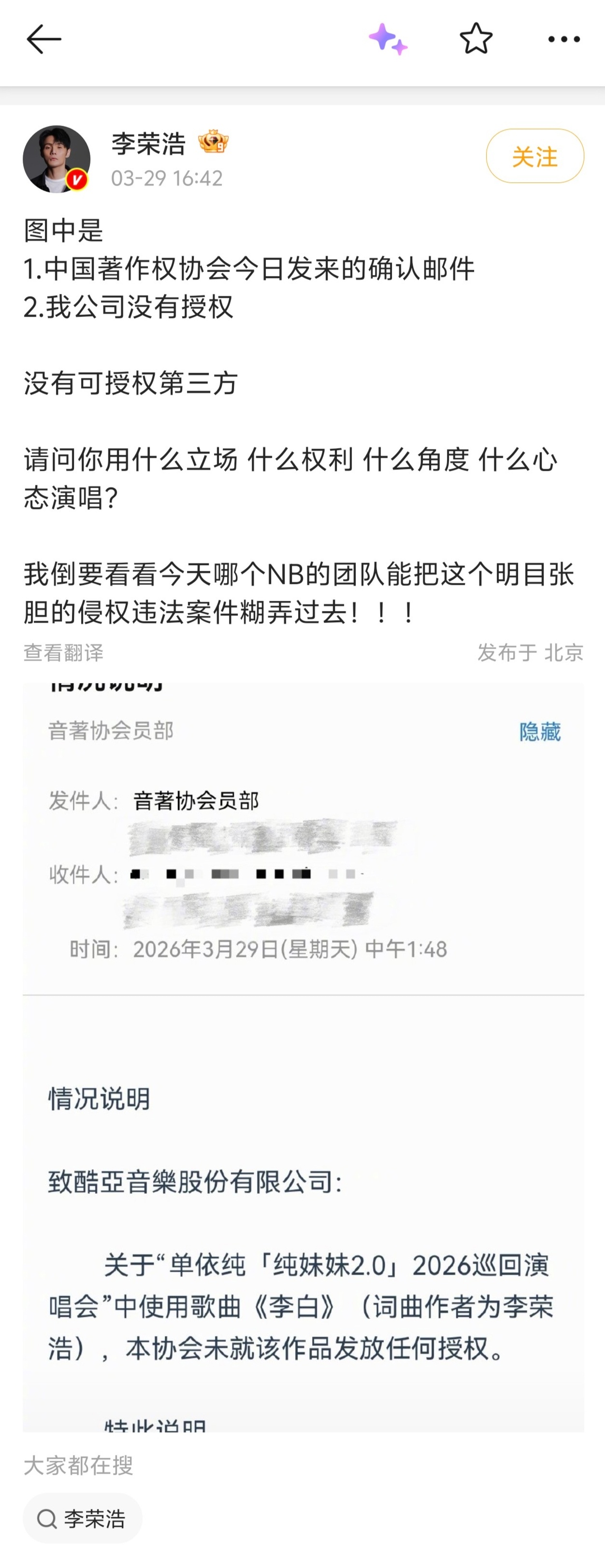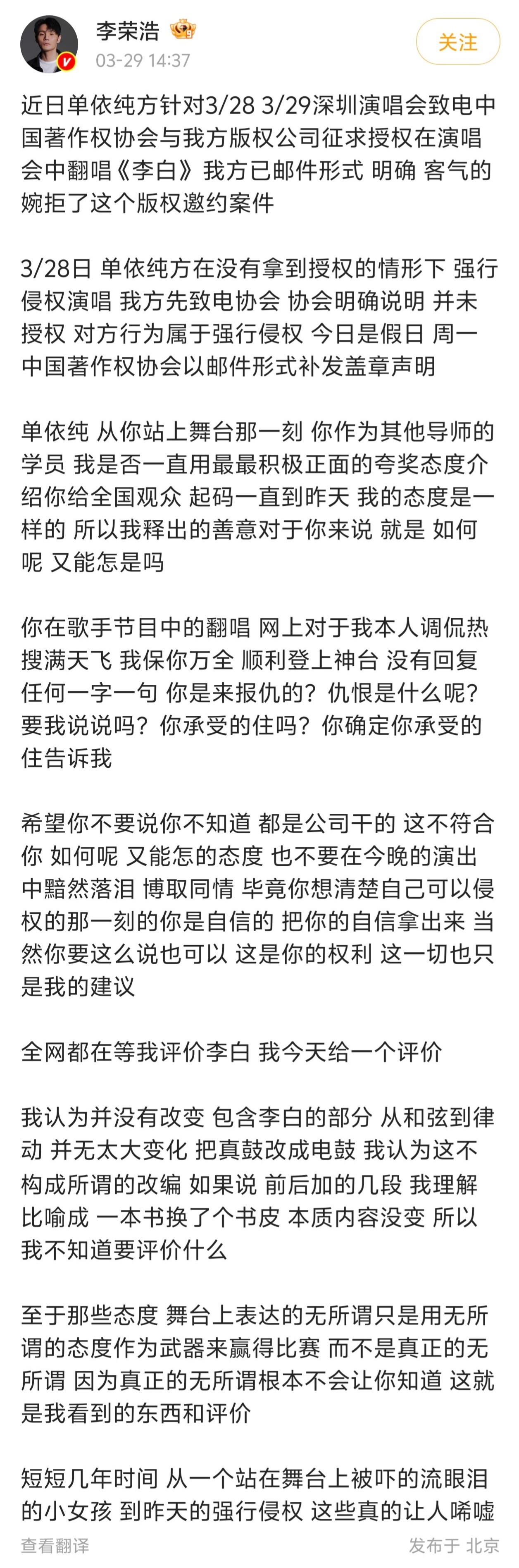 李荣浩 单依纯强行侵权 我靠,有什么过节吗?没想和解的意思。